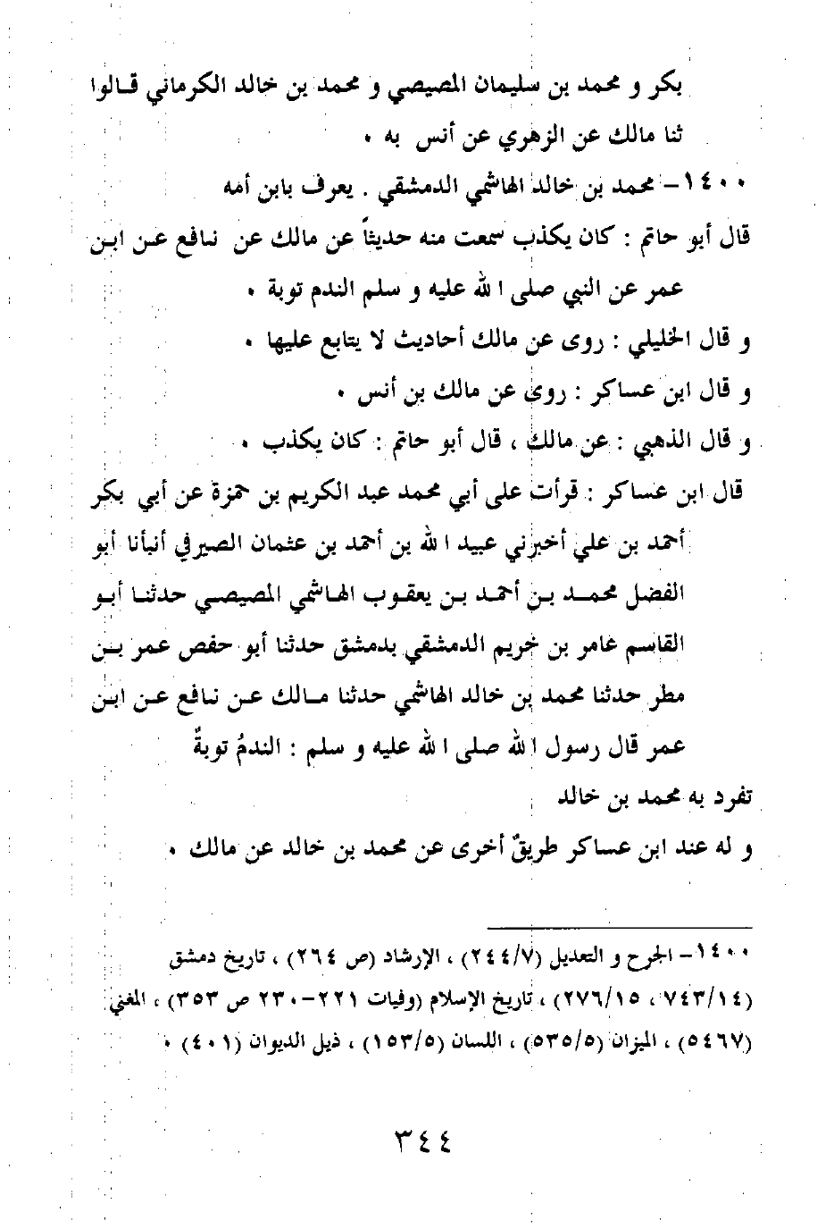 قال ابن عساكر: قرأت على أبي محمد عبد الكريم بن حمزة عن أبي بكر أحمد بن علي، أخبرني عبيد الله بن أحمد بن عثمان الصيرفي، أنبأنا أبو الفضل محمد بن أحمد بن يعقوب الهاشمي المصيصي، حدثنا أبو القاسم عامر بن خريم الدمشقي بدمشق، حدثنا أبو حفص عمر بن مطر، حدثنا محمد بن خالد الهاشمي، حدثنا مالك، عن نافع، عن ابن عمر قال رسول الله صلى الله عليه وسلم: الندم توبةٌ.