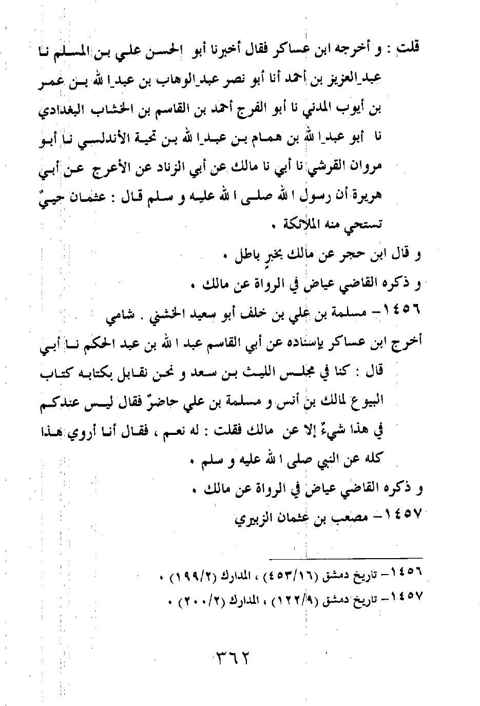 قلت: وأخرجه ابن عساكر فقال أخبرنا أبو الحسن علي بن المسلم نا عبد العزيز بن أحمد، أنا أبو نصر عبد الوهاب بن عبد الله بن عمر بن أيوب المدني، نا أبو الفرج أحمد بن القاسم بن الخشاب البغدادي، نا أبو عبد الله بن همام بن عبد الله بن تحية الأندلسي نا أبو مروان القرشي، نا أبي، نا مالك عن أبي الزناد، عن الأعرج، عن أبي هريرة أن رسول الله صلى الله عليه وسلم قال: عثمان حييٌ تستحي منه الملائكة.