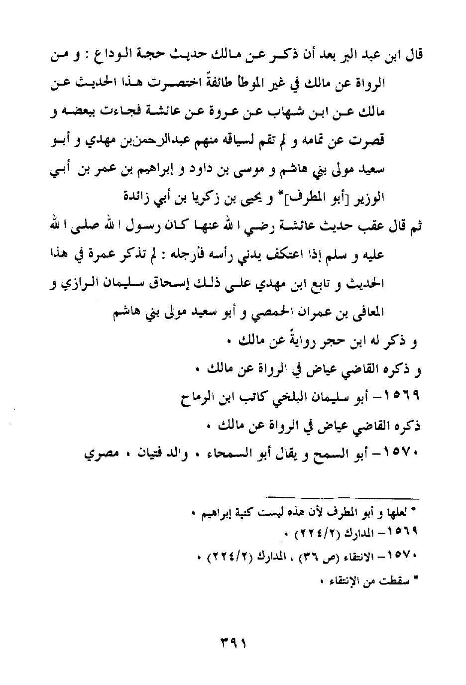 قال ابن عبد البر بعد أن ذكر عن مالك حديث حجة الوداع: ومن الرواة عن مالك في غير الموطأ طائفةٌ اختصرت هذا الحديث عن مالك عن ابن شهاب عن عروة، عن عائشة فجاءت ببعضه وقصرت عن تمامه ولم تقم لسياقه منهم عبد الرحمن بن مهدي وأبو سعيد مولى بني هاشم وموسى بن داود وإبراهيم بن عمر بن أبي الوزير [أبو المطرف] ويحيى بن زكريا بن أبي زائدة.