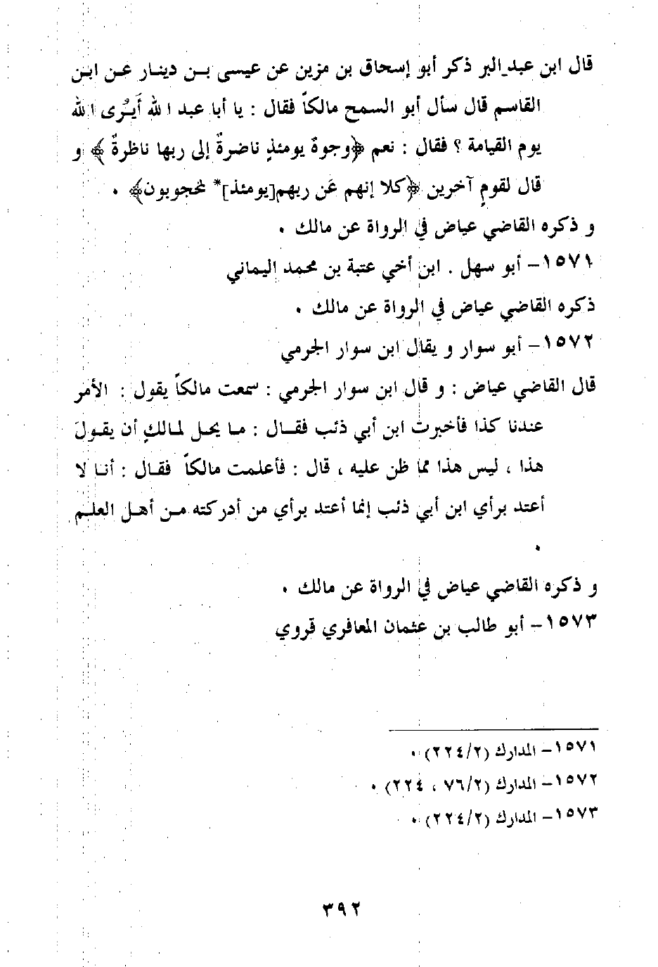 قال ابن عبد البر ذكر أبو إسحاق بن مزين عن عيسى بن دينار، عن ابن القاسم قال سأل أبو السمح مالكاً فقال: يا أبا عبد الله أيرى الله يوم القيامة؟ فقال: نعم {وجوهٌ يومئذٍ ناضرةٌ إلى ربها ناظرةٌ} وقال لقومٍ آخرين {كلا إنهم عن ربهم [يومئذ] لمحجوبون} .