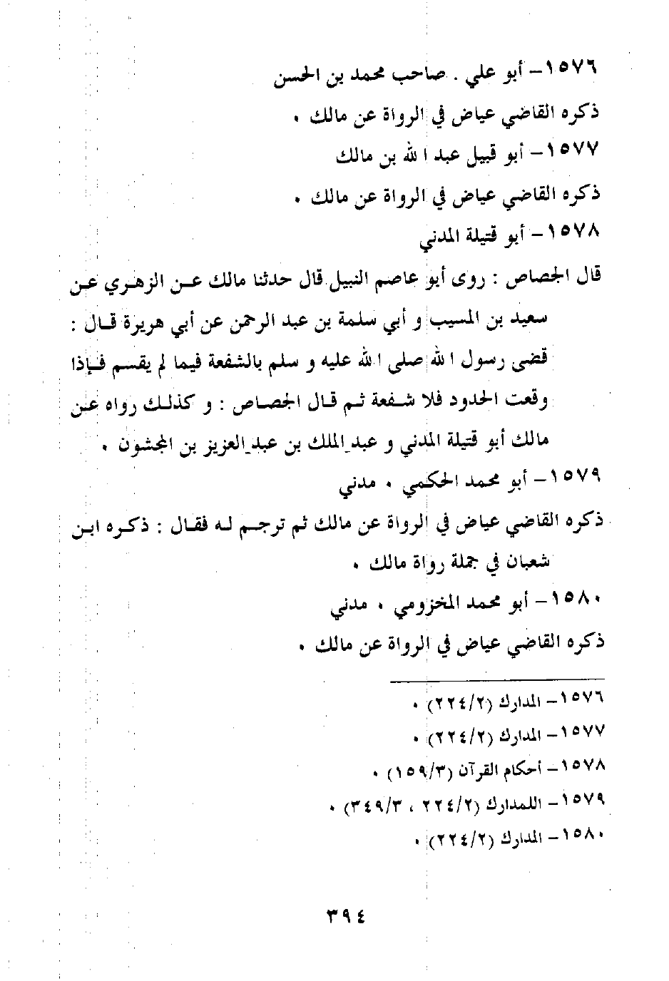 قال الجصاص: روى أبو عاصم النبيل قال: حدثنا مالك عن الزهري، عن سعيد بن المسيب وأبي سلمة بن عبد الرحمن، عن أبي هريرة قال: قضى رسول الله صلى الله عليه وسلم بالشفعة فيما لم يقسم فإذا وقعت الحدود فلا شفعة ثم قال الجصاص: وكذلك رواه عن مالك أبو قتيلة المدني وعبد الملك بن عبد العزيز بن المجشون.
