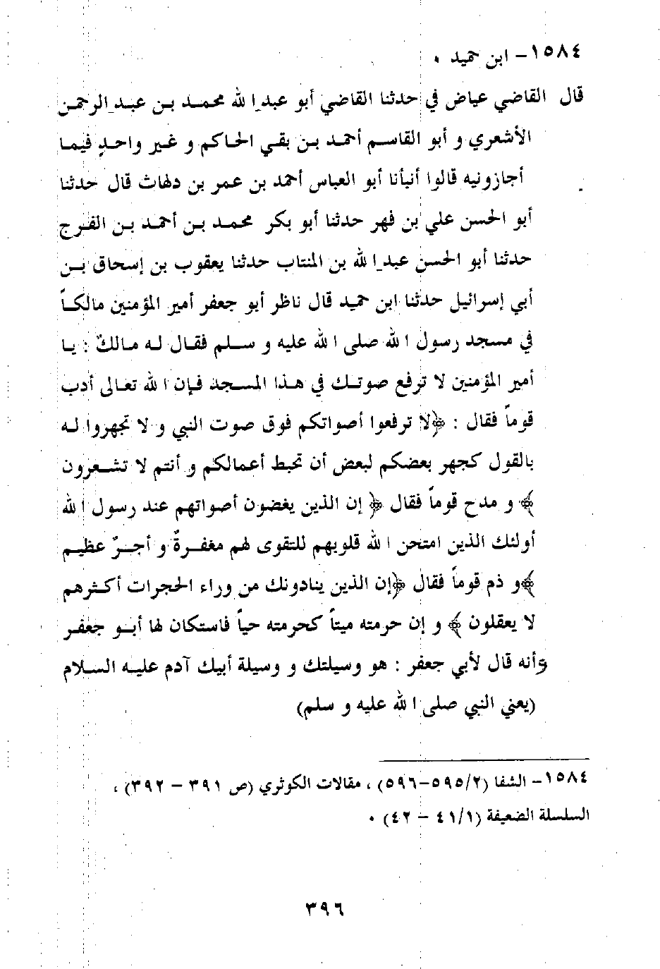 قال القاضي عياض في حدثنا القاضي أبو عبد الله محمد بن عبد الرحمن الأشعري وأبو القاسم أحمد بن بقي الحاكم وغير واحدٍ فيما أجازونيه قالوا: أنبأنا أبو العباس أحمد بن عمر بن دلهاث قال: حدثنا أبو الحسن علي بن فهر، حدثنا أبو بكر محمد بن أحمد بن الفرج، حدثنا أبو الحسن عبد الله بن المنتاب، حدثنا يعقوب بن إسحاق بن أبي إسرائيل، حدثنا ابن حميد قال: ناظر أبو جعفر أمير المؤمنين مالكاً في مسجد رسول الله صلى الله عليه وسلم فقال له مالكٌ: يا أمير المؤمنين لا ترفع صوتك في هذا المسجد فإن الله تعالى أدب قوماً فقال: {لا ترفعوا أصواتكم فوق صوت النبي ولا تجهروا له بالقول كجهر بعضكم لبعض أن تحبط أعمالكم وأنتم لا تشعرون} ومدح قوماً فقال: {إن الذين يغضون أصواتهم عند رسول الله أولئك الذين امتحن الله قلوبهم للتقوى لهم مغفرةٌ وأجرٌ عظيم} وذم قوماً فقال: {إن الذين ينادونك من وراء الحجرات أكثرهم لا يعقلون} وإن حرمته ميتاً كحرمته حياً فاستكان لها أبو جعفر وأنه قال لأبي جعفر: هو وسيلتك ووسيلة أبيك آدم عليه السلام (يعني النبي صلى الله عليه وسلم) .