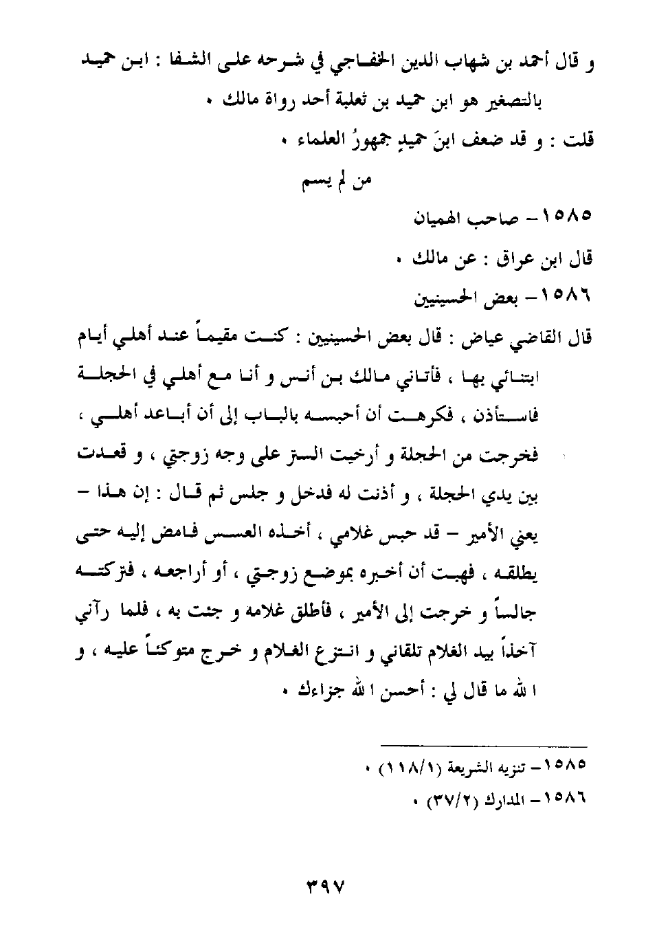 وقال أحمد بن شهاب الدين الخفاجي في شرحه على الشفا: ابن حميد بالتصغير هو ابن حميد بن ثعلب أحد رواة مالك.