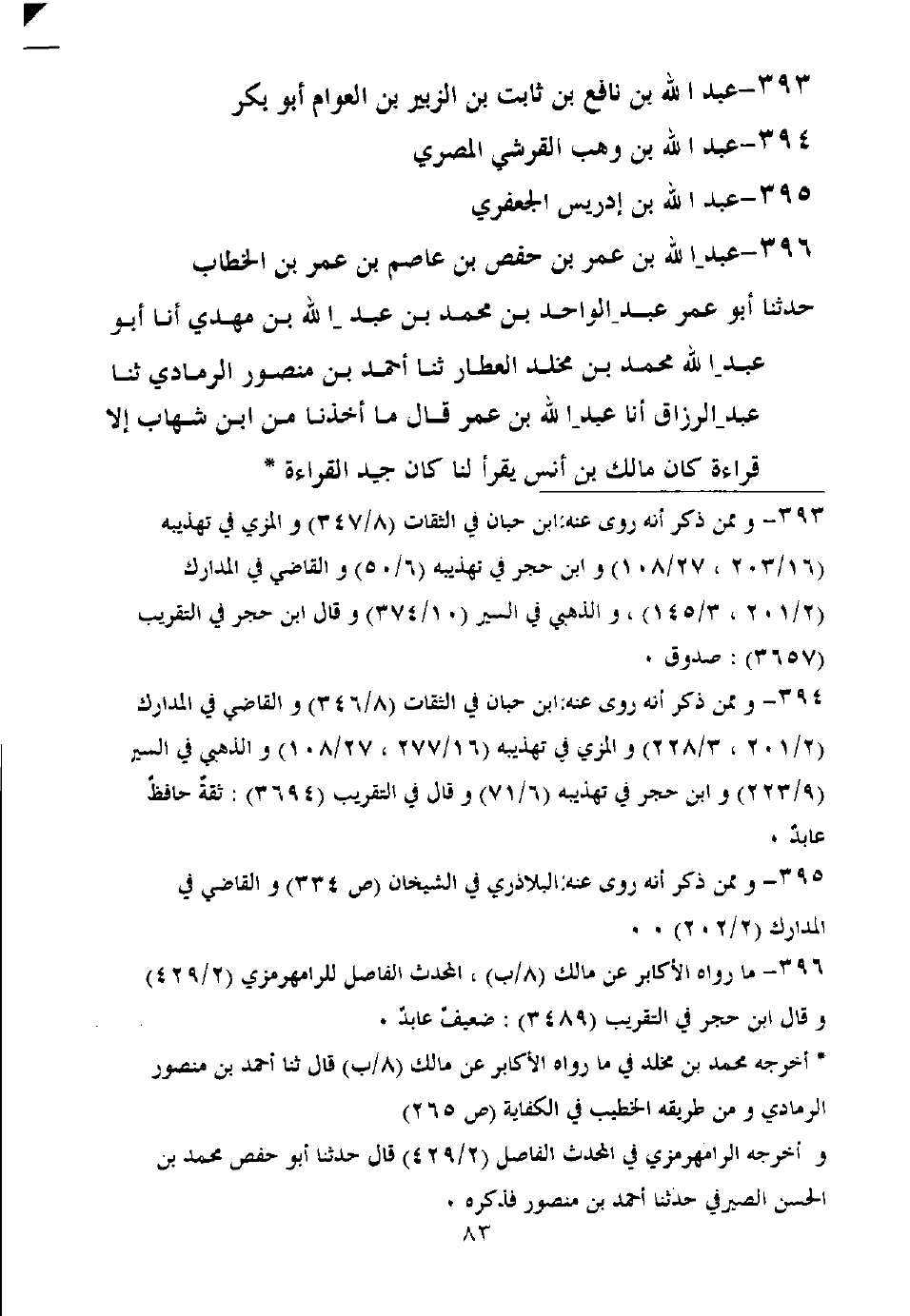 حدثنا أبو عمر عبد الواحد بن محمد بن عبد الله بن مهدي أنا أبو عبد الله محمد بن مخلد العطار ثنا أحمد بن منصور الرمادي ثنا عبد الرزاق أنا عبد الله بن عمر قال ما أخذنا من ابن شهاب إلا قراءة كان مالك بن أنس يقرأ لنا كان جيد القراءة.