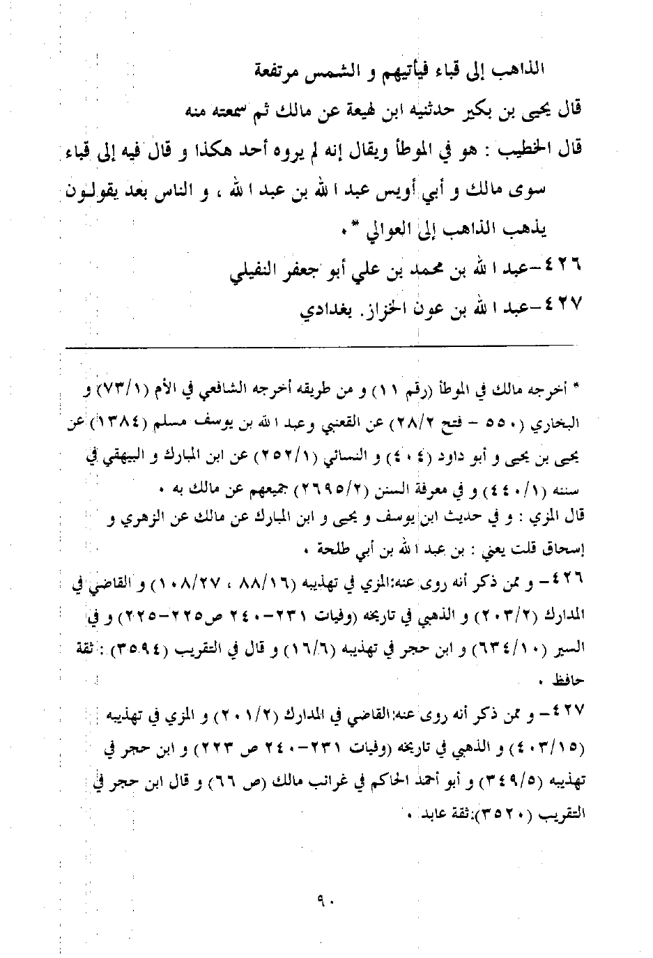قال الخطيب: هو في الموطأ ويقال إنه لم يروه أحد هكذا وقال فيه إلى قباء سوى مالك وأبي أويس عبد الله بن عبد الله، والناس بعد يقولون يذهب الذاهب إلى العوالي.