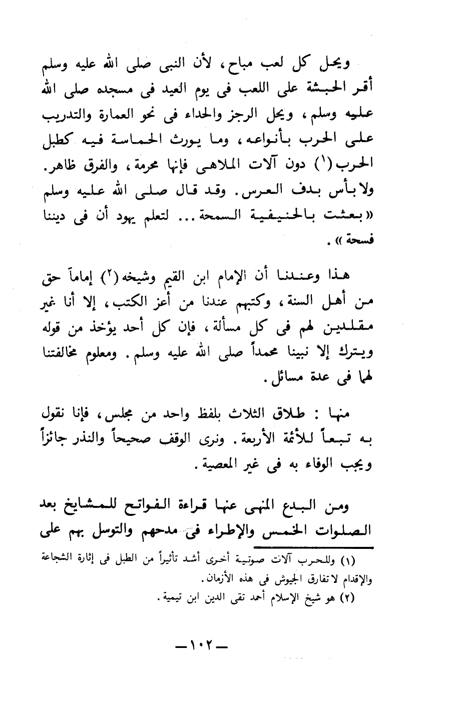منها: طلاق الثلاث بلفظ واحد من مجلس، فإنا نقول به تبعاً للأئمة الأربعة. ونرى الوقف صحيحاً والنذر جائزاً ويجب الوفاء به في غير المعصية.