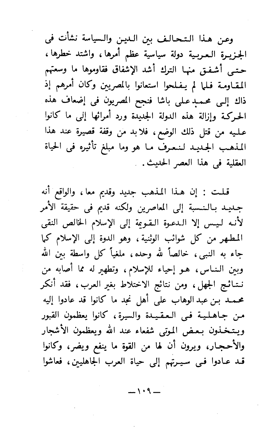 وعن هذا التحالف بين الدين والسياسة نشأت في الجزيرة العربية دولة سياسية عظم أمرها، واشتد خطرها، حتى أشفق منها الترك أشد الإشفاق فقاوموها ما وسعتهم المقاومة فلما لم يفلحوا استعانوا بالمصريين وكان أمرهم إذ ذاك إلى محمد على باشا فنجح المصريون في إضعاف هذه الحركة وإزالة هذه الدولة الجديدة ورد أمرائها إلى ما كانوا عليه من قتل ذلك الوضع. فلا بد من وقفة قصيرة عند هذا المذهب الجديد لنعرف ما هو وما مبلغ تأثيره في الحياة العقلية في هذا العصر الحديث.