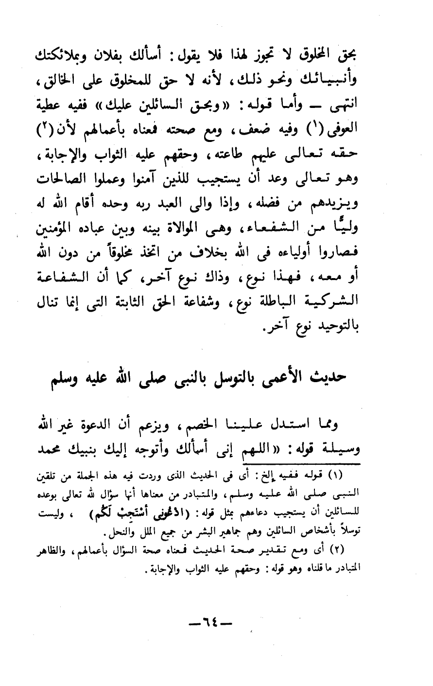 بحق المخلوق لا تجوز لهذا فلا يقول: أسألك بفلان وبملائكتك وأنبيائك ونحو ذلك، لأنه لا حق للمخلوق على الخالق، انتهى – أما قوله: "وبحق السائلين عليك" ففيه عطية العوفي 1 وفيه ضعف، ومع صحته فمعناه بأعمالهم لأن 2حقه تعالى عليهم طاعته، وحقهم عليه الثواب والإجابة، وهو تعالى وعد أن يستجيب للذين آمنوا وعلموا الصالحات ويزيدهم من فضله، وإذا والى العبد ربه وحده أقام الله له ولياًّ من الشفعاء، وهى الموالاة بينه وبين عباده المؤمنين فصاروا أولياءه في الله بخلاف من اتخذ مخلوقاً من دون الله أو معه، فهذا نوع، وذاك نوع آخر، كما أن الشفاعة الشركية الباطلة نوع، وشفاعة الحق الثابتة التي إنما تنال بالتوحيد نوع آخر.