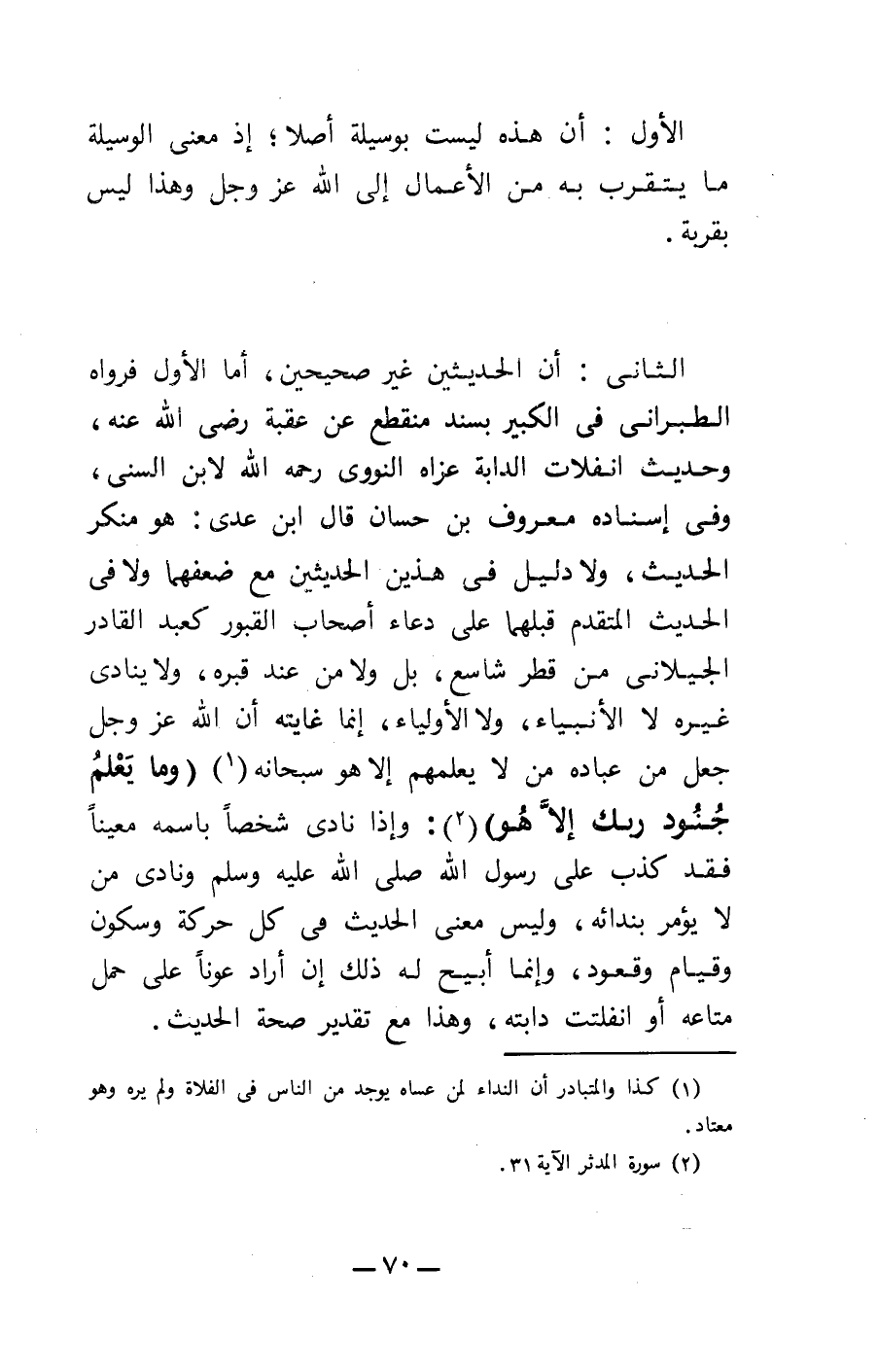 الثاني: أن الحديثين غير صحيحين، أما الأول فرواه الطبراني في الكبير بسند منقطع عن عقبة رضي الله عنه، وحديث انفلات الدابة عزاه النووي رحمه الله لابن السني، وفي إسناده معروف بن حسان قال ابن عدي: هو منكر الحديث، ولا دليل في هذين الحديثين مع ضعفهما ولا في الحديث المتقدم قبلهما على دعاء أصحاب القبور كعبد القادر الجيلاني من قطر شاسع، بل ولا من عند قبره، ولا ينادي غيره لا الأنبياء، ولا الأولياء، إنما غايته أن الله عز وجل جعل من عباده من لا يعلمهم إلا هو سبحانه 1 {وَمَا يَعْلَمُ جُنُودَ رَبِّكَ إِلَّا هُوَ} 2 وإذا نادى شخصاً باسمه معيناً فقد كذب على رسول الله صلى الله عليه وسلم ونادى من لا يؤمر بندائه، وليس معنى الحديث في كل حركة وسكون وقيام وقعود، وإنما أبيح له ذلك إن أراد عوناً على حمل متاعه أو انفلتت دابته، وهذا مع تقدير صحة الحديث.