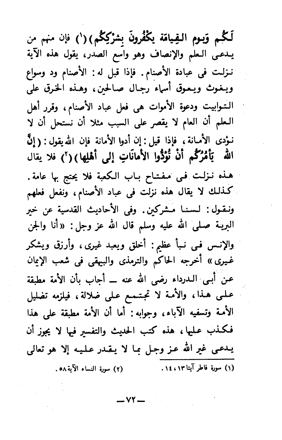 لَكُمْ وَيَوْمَ الْقِيَامَةِ يَكْفُرُونَ بِشِرْكِكُمْ} 1 فإن منهم من يدعي العلم والإنصاف وهو واسع الصدر، يقول هذه الآية نزلت في عبادة الأصنام. فإذا قيل له: الأصنام ود وسواع ويغوث ويعوق أسماء رجال صالحين، وهذه الخرق على التوابيت ودعوة الأموات هي فعل عباد الأصنام، وقرر أهل العلم أن العام لا يقصر على السبب مثلا أن نستحل أن لا نؤدي الأمانة، فإذا قيل: إن أدوا الأمانة فإن الله يقول: {إِنَّ اللَّهَ يَأْمُرُكُمْ أَنْ تُؤَدُّوا الْأَمَانَاتِ إِلَى أَهْلِهَا} 2 فلا يقال هذه نزلت في مفتاح باب الكعبة فلا يحتج بها عامة. كذلك لا يقال هذه نزلت في عباد الأصنام، ونفعل فعلهم ونقول: لسنا مشركين. وفي هذه الأحاديث القدسية عن خير البرية صلى الله عليه وسلم قال الله عز وجل: "أنا والجن والإنس في نبأ عظيم: أخلق ويعبد غيري، وأرزق ويشكر غيري" أخرجه الحاكم والترمذي والبيهقي في شعب الإيمان عن أبي الدرداء رضي الله عنه – أجاب بأن الأمة مطبقة على هذا والأمة لا تجتمع على ضلالة، فيلزمه تضليل الأمة وتسفيه الآباء، وجوابه: أما أن الأمة مطبقة على هذا فكذب عليها، هذه كتب الحديث والتفسير فيها لا يجوز أن يدعى غير الله عز وجل بما لا يقدر عليه إلا هو تعالى