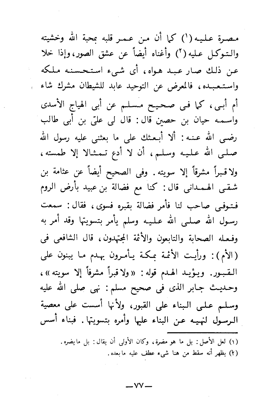 مصرة عليه 1 كما أن من عمر قلبه بمحبة الله وخشيته والتوكل عليه 2 وأغناه أيضاً عن عشق الصور، وإذا خلا عن ذلك صار عبد هواه، أي شيء استحسنه ملكه واستعبده، فالمعرض عن التوحيد عابد للشيطان مشرك شاء أم أبى، كما في صحيح مسلم عن أبي الهياج الأسدي واسمه حيان بن حصين قال: قال لي عليّ بن أبي طالب رضي الله عنه: ألا أبعثك على ما بعثني عليه رسول الله صلى الله عليه وسلم، "أن لا أدع تمثالا إلا طمسته، ولا قبراً مشرقاً إلا سويته". وفي الصحيح أيضا عن عثامة بن شقى الهمداني قال: كنا مع فضالة بن عبيد بأرض الروم فتوفى صاحب لنا فأمر فضالة بقبره فسوى، فقال: "سمعت رسول الله صلى الله عليه وسلم يأمر بتسويتها" وقد أمر به وفعله الصحابة والتابعون والأئمة المجتهدون، قال الشافعي في "الأم":ورأيت الأئمة بمكة يأمرون بهدم ما يبنون على القبور. ويؤيد الهدم قوله: "ولا قبراً مشرفاً إلا سويته"، وحديث جابر الذي في صحيح مسلم: "نهى صلى الله عليه وسلم على البناء على القبور"، ولأنها أسست على معصية الرسول لنهيه عن البناء عليها وأمره بتسويتها. فبناء أسس