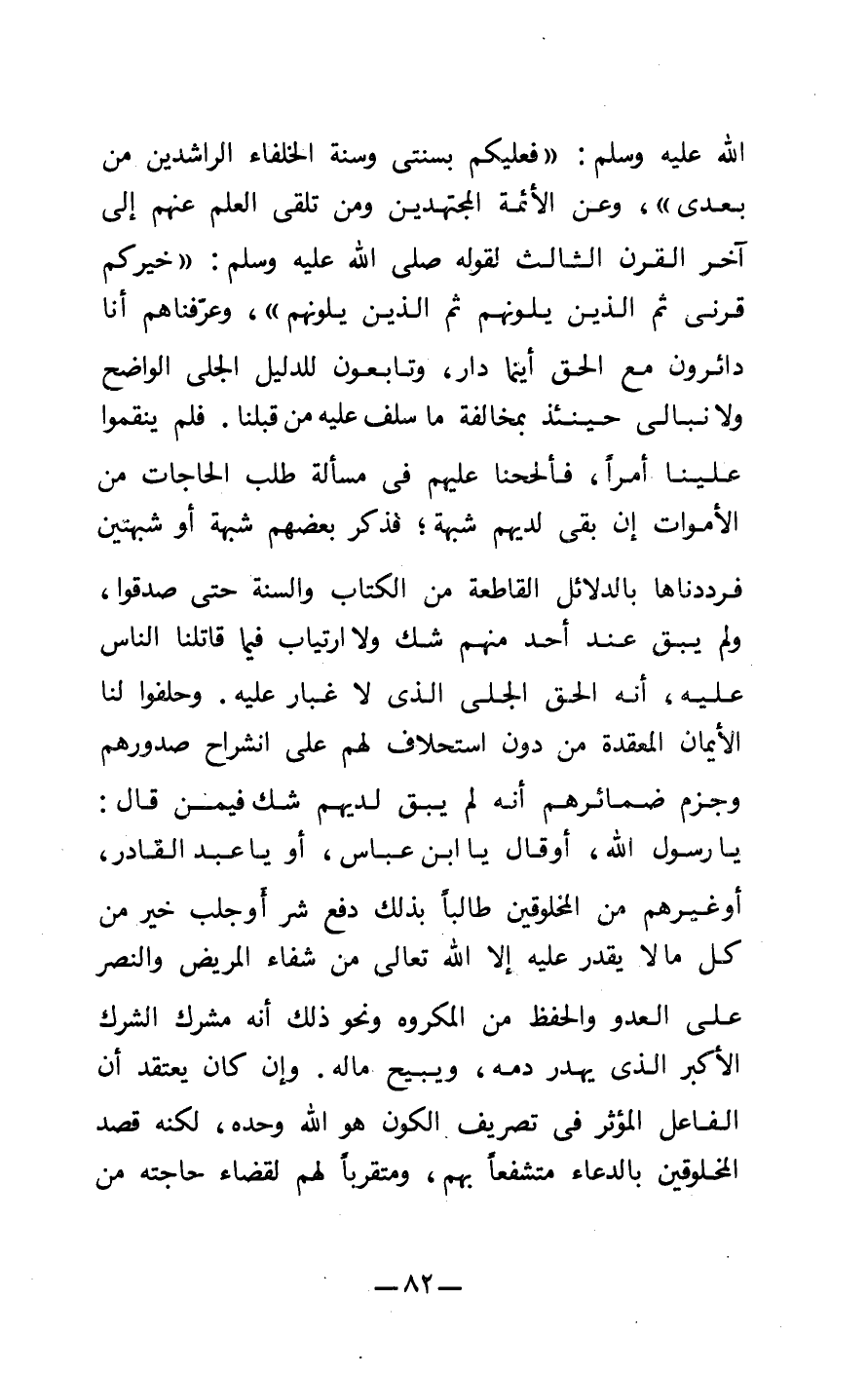 الله عليه وسلم: "فعليكم بسنتي وسنة الخلفاء الراشدين من بعدي"، عن الأئمة المجتهدين ومن تلقى العلم عنهم إلى آخر القرن الثالث لقوله صلى الله عليه وسلم: "خيركم قرني ثم الذين يلونهم ثم الذين يلونهم"، وعرّفناهم أنا دائرون مع الحق أينما دار، وتابعون للدليل الجلي الواضح ولا نبالي حينئذ بمخالفة ما سلف عليه من قبلنا. فلم ينقموا علينا أمراً، فألححنا عليهم في مسألة طلب الحاجات من الأموات إن بقي لديهم شبهة؛ فذكر بعضهم شبهة أو شبهتين فرددناها بالدلائل القاطعة من الكتاب والسنة حتى صدقوا، ولم يبق عند أحد منهم شك ولا ارتياب فيما قاتلنا الناس عليه، أنه الحق الجلي الذي لا غبار عليه. وحلفوا لنا الأيمان المعقدة من دون استحلاف لهم على انشراح صدورهم وجزم ضمائرهم أنه لم يبق لديهم شك فيمن قال: يا رسول الله، أو قال يا ابن عباس، أو يا عبد القادر، أو غيرهم من المخلوقين طالباً بذلك دفع شر أو جلب خير من كل مالا يقدر عليه إلا الله تعالى من شفاء المريض والنصر على العدو والحفظ من المكروه ونحو ذلك أنه مشرك الشرك الأكبر الذي يهدر دمه، ويبيح ماله. وإن كان يعتقد أن الفاعل المؤثر في تصريف الكون هو الله وحده، لكنه قصد المخلوقين بالدعاء متشفعاً بهم، ومتقرباً لهم لقضاء حاجته من
