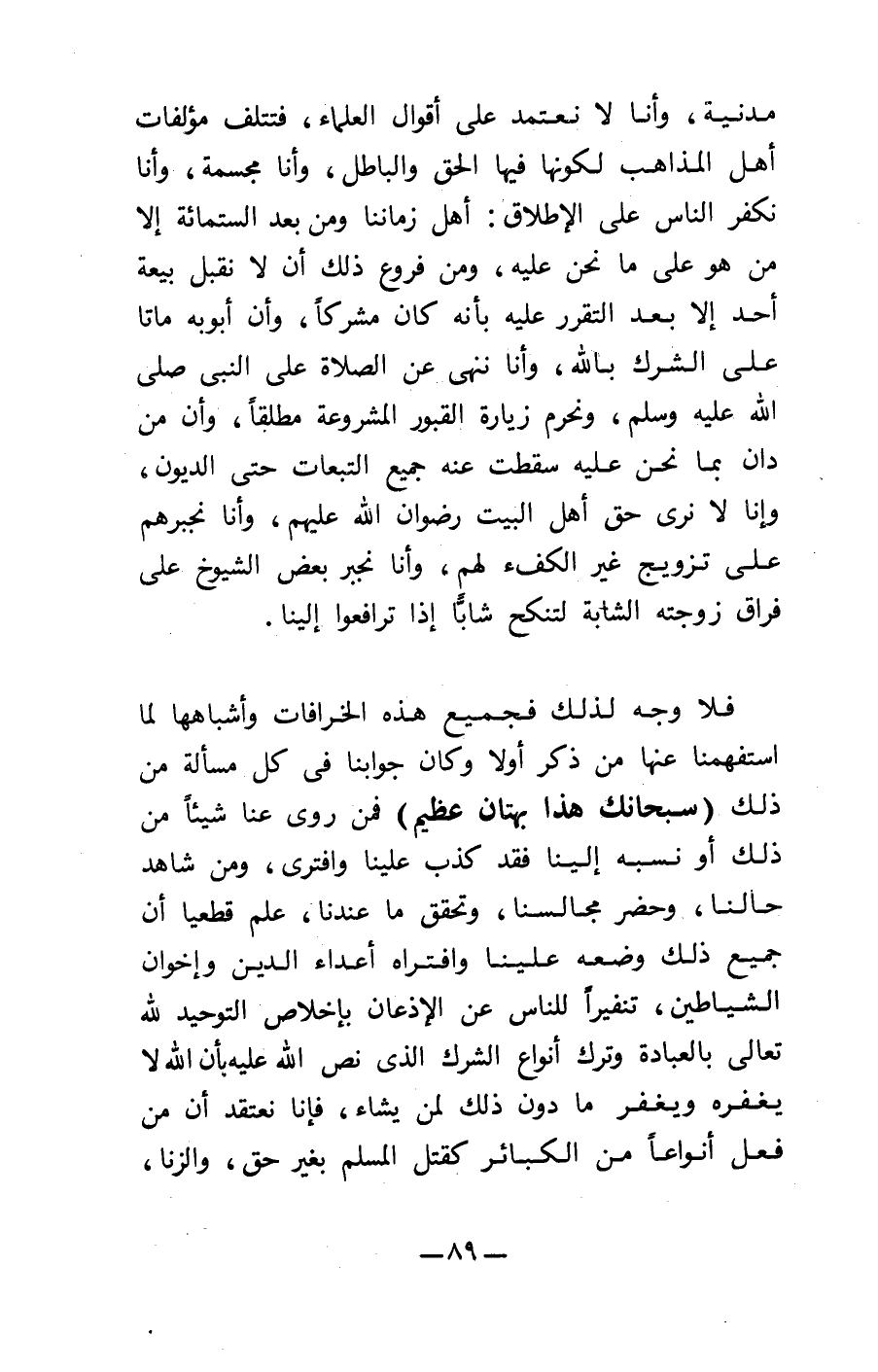 فلا وجه لذلك فجميع هذه الخرافات وأشباهها لما استفهمنا عنها من ذكر أولا وكان جوابنا في كل مسألة من ذلك {سُبْحَانَكَ هَذَا بُهْتَانٌ عَظِيمٌ} فمن روى عنا شيئاً من ذلك أو نسبه إلينا فقد كذب عينا وافترى، ومن شاهد حالنا، وحضر مجالسنا، وتحقق ما عندنا، علم قطعيا أن جميع ذلك وضعه علينا وافتراه أعداء الدين وإخوان الشياطين، تنفيراً للناس عن الإذعان بإخلاص التوحيد الله تعالى بالعبادة وترك أنواع الشرك الذي نص الله عليه بأن الله لا يغفره ويغفر ما دون ذلك لمن يشاء، فإنا نعتقد أن من فعل أنواعاً من الكبائر كقتل المسلم بغير حق، والزنا،