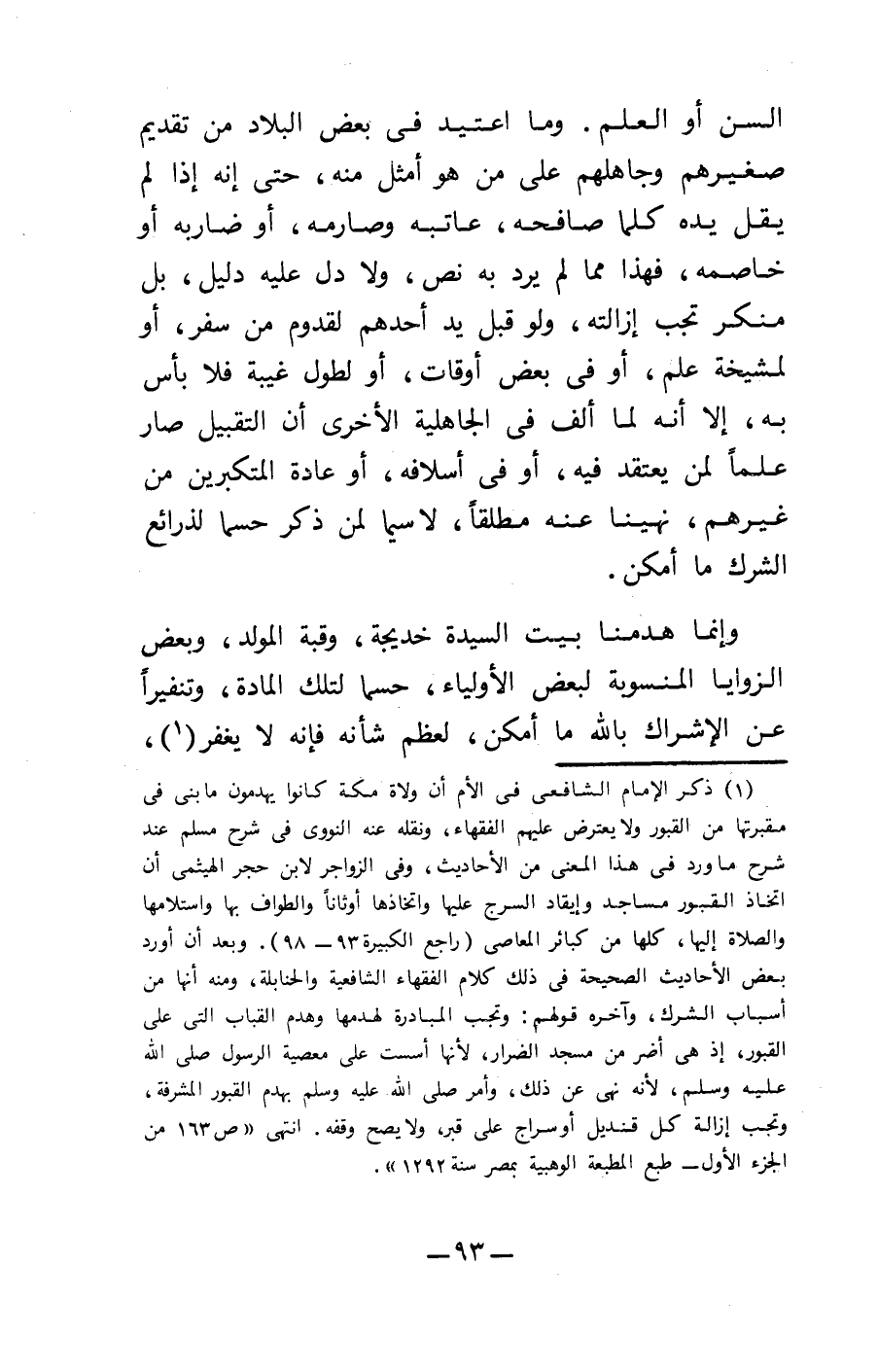 1 ذكر الإمام الشافعي في الأم أن ولاة مكة كانوا يهدمون ما بنى في مقبرتها من القبور ولا يعترض عليهم الفقهاء، ونقله عنه النووي في شرح مسلم عند شرح ما ورد في هذا المعنى من الأحاديث، وفي الزواجر لابن حجر الهيثمى أن اتخاذ القبور مساجد وإيقاد السرج عليها واتخاذها أوثاناً والطواف بها واستلامها والصلاة إليها، كلها من كبائر المعاصي "راجع الكبيرة 93- 98" وبعد أن أورد بعض الأحاديث الصحيحة في ذلك كلام الفقهاء الشافعية والحنابلة، ومنه أنها من أسباب الشرك، وآخره قولهم: وتجب المبادرة لهدمها وهدم القباب التي على القبور، إذ هي أضر من مسجد الضرار، لأنها أسست علي معصية الرسول صلى الله عليه وسلم، لأنه نهى عن ذلك، وأمر صلى الله عليه وسلم بهدم القبور المشرفة، وتجب إزالة كل قنديل أو سراج على قبر، ولا يصح وفقه. انتهى "ص163 من الجزء الأول – طبع المطبعة الوهبية بمصر سنة 1292".
