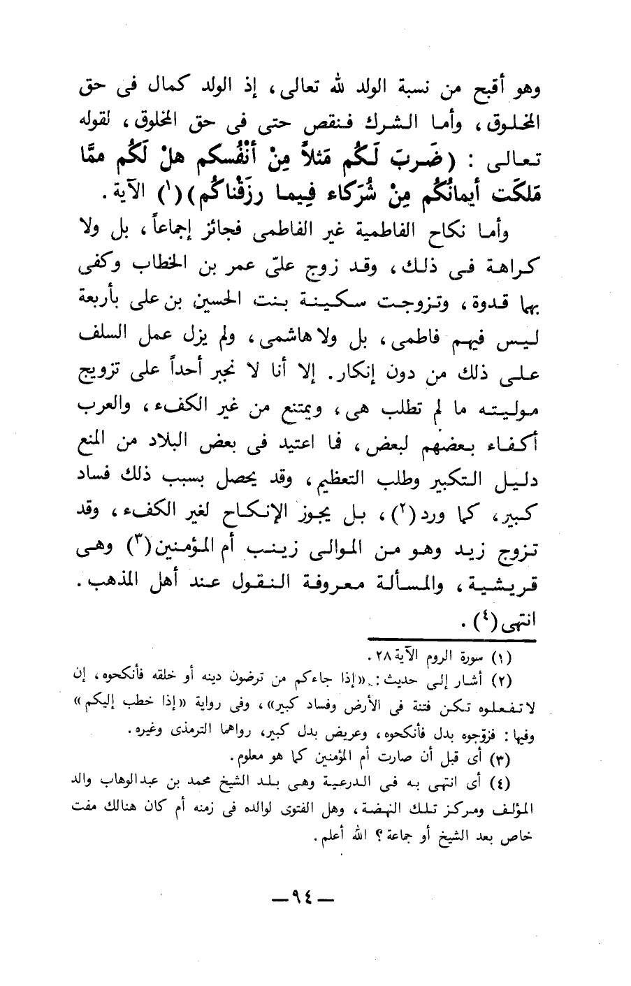 وأما نكاح الفاطمية غير الفاطمي فجائز إجماعاً، بل ولا كراهة في ذلك، وقد زوج عليّ عمر بن الخطاب وكفى بهما قدوة، وتزوجت سكينة بنت الحسين بن على بأربعة ليس فيهم فاطمي، بل ولا هاشمي، ولم يزل عمل السلف على ذلك من دون إنكار. إلا أنا لا نجبر أحداً على تزويج موليته ما لم تطلب هي، ويمتنع من غير الكفء، والعرب أكفاء بعضهم لبعض، فما أعتيد في بعض البلاد من المنع دليل التكبير وطلب التعظيم، وقد يحصل بسبب ذلك فساد كبير، كما ورد 2، بل يجوز الإنكاح لغير الكفء، وقد تزوج زيد وهو من الموالى زينب أم المؤمنين وهى 3 قريشية، والمسألة معروفة النقول عند أهل المذهب. انتهى 4