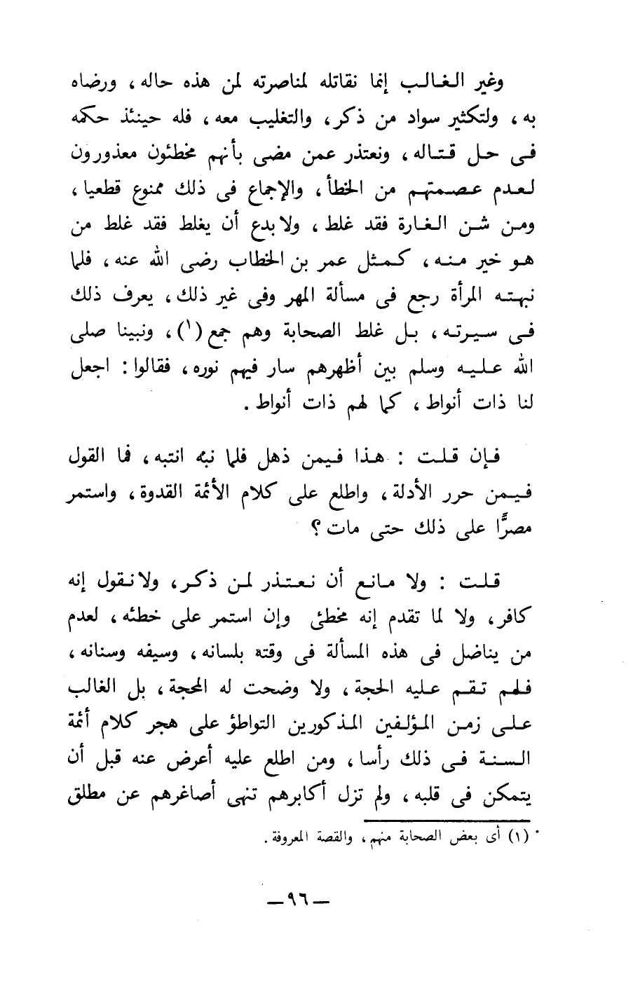 وغير الغالب إنما نقاتله لمناصرته لمن هذه حاله، ورضاه به، ولتكثير سواد من ذكر، والتغليب معه، فله حينئذ حكمه في حل قتاله، ونعتذر عمن مضى بأنهم مخطئون معذورون لعدم عصمتهم من الخطأ، والإجماع في ذلك ممنوع قطعيا، ومن شن الغارة فقد غلط ولا بدع أن يغلط فقد غلط من هو خير منه، كمثل عمر بن الخطاب رضي الله عنه، فلما نبهته المرأة رجع في مسألة المهر وفي غير ذلك، يعرف ذلك في سيرته، بل غلط الصحابة وهم جمع 1 ونبينا صلى الله عليه وسلم بين أظهرهم سار فيهم نوره، فقالوا: اجعل لنا ذات أنواط، كما لهم ذات أنواط.