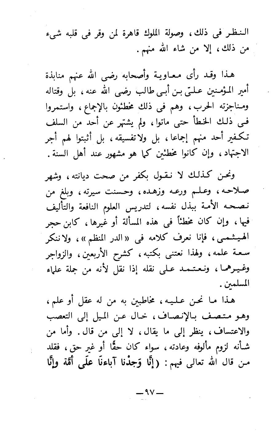 ونحن كذلك لا نقول بكفر من صحت ديانته وشهر صلاحه، وعلم ورعه وزهده، وحسنت سيرته، وبلغ من نصحه الأمة ببذل نفسه، لتدريس العلوم النافعة والتأليف فيها، وإن كان مخطئاً في هذه المسألة أو غيرها، كابن حجر الهيثمى، فإنا نعرف كلامه في "الدر المنظم"، ولا ننكر سعة علمه، ولهذا نعتني بكتبه، كشرح الأربعين، والزواجر وغيرهما، ونعتمد على نقله إذا نقل لأنه من جملة علماء المسلمين.