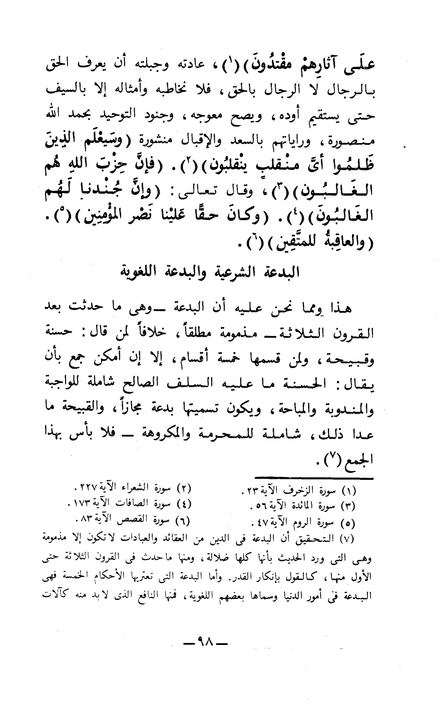 1 التحقيق أن البدعة في الدين من العقائد والعبادات لا تكون إلا مذمومة وهى التي ورد الحديث بأنها كلها ضلالة، ومنها ما حدث في القرون الثلاثة حتى الأول منها، كالقول بإنكار القدر، وأما البدعة التي تعتريها الأحكام الخمسة فهي البدعة في أمور الدنيا وسماها بعضهم اللغوية، فمنها النافع الذي لا بد منه كآلات الحرب الحديثة وهو واجب، ومنها الضار قطعاً وهو محرم، وما دون ذلك، وهو مستحب أو مكروه أو مباح.