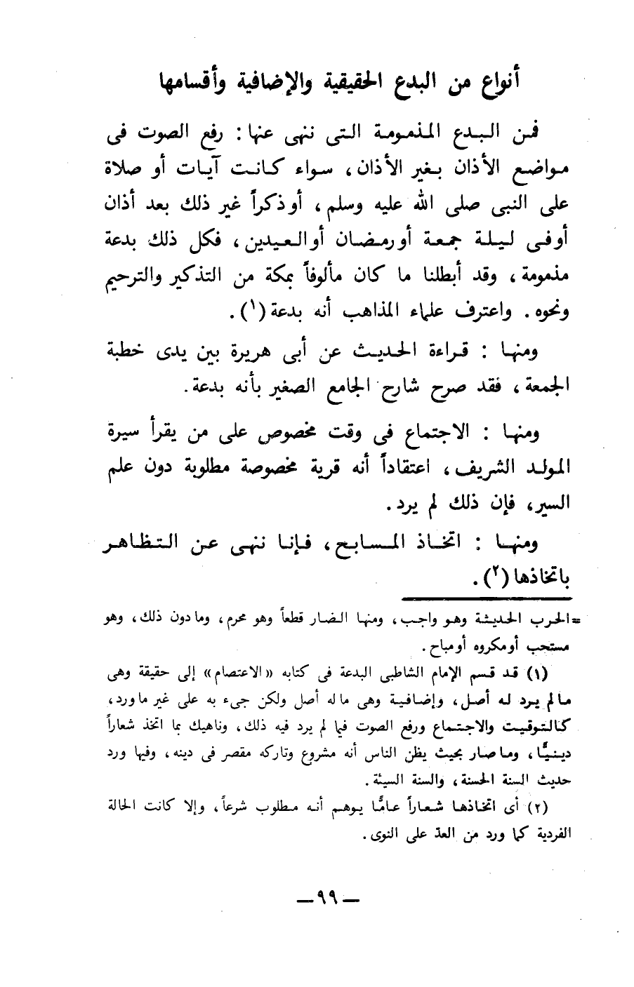 1 قد قسم الإمام الشاطبي البدعة في كتابه "الاعتصام" إلى حقيقة وهى ما لم يرد له أصل، وإضافية وهي ما له أصل ولكن جئ به على غير ما ورد، كالتوقيت والاجتماع ورفع الصوت فيما لم يرد فيه ذلك، وناهيك بما اتخذ شعاراً دينياً، وما صار بحيث يظن الناس أنه مشروع وتاركه مقصر في دينه، وفيها ورد حديث السنة الحسنة، والسنة السيئة.