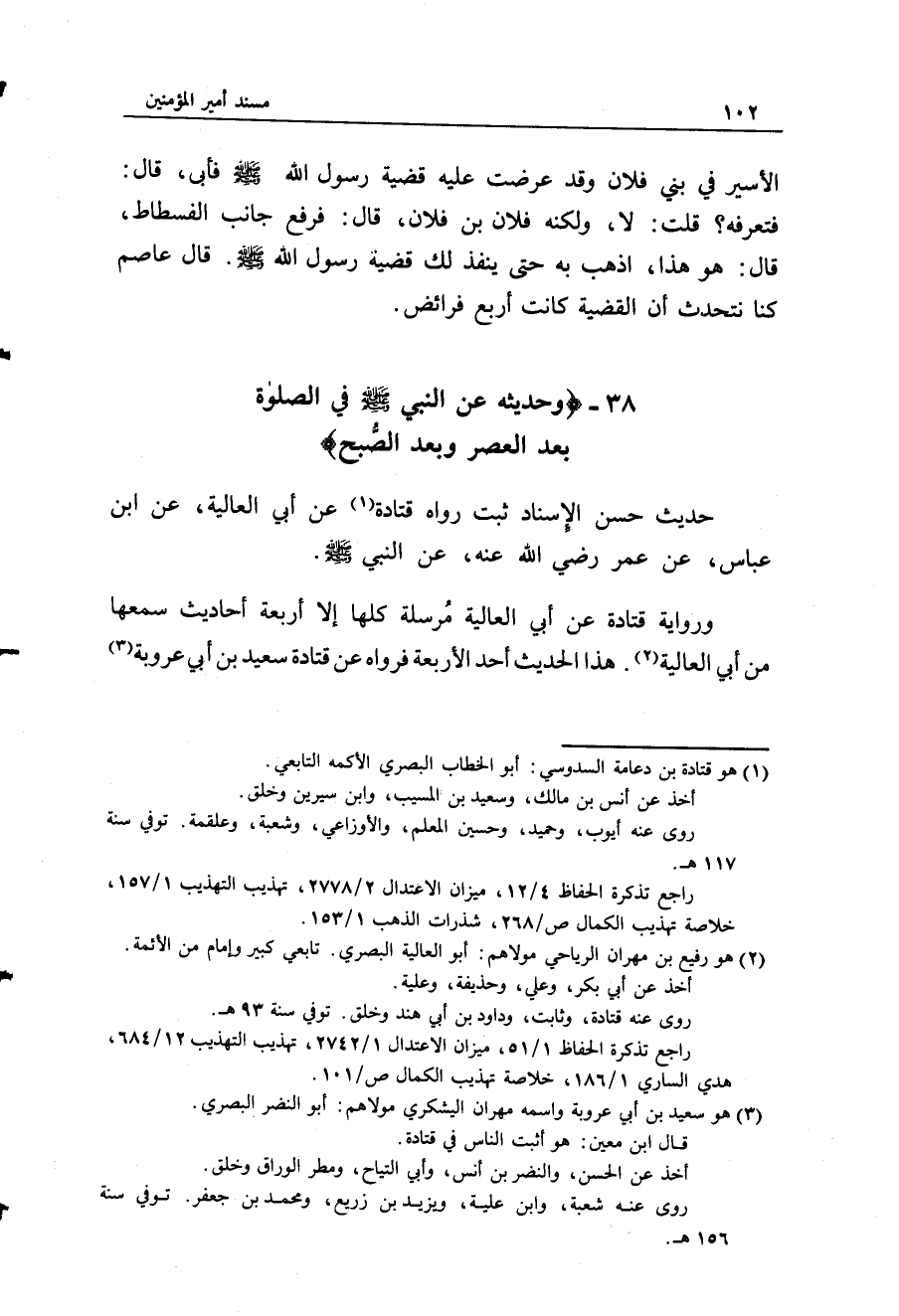 §38 - وَحَدِيثُهُ عَنِ النَّبِيِّ صَلَّى اللهُ عَلَيْهِ وَسَلَّمَ فِي الصَّلَاةِ بَعْدَ الْعَصْرِ وَبَعْدَ الصُّبْحِ حَدِيثٌ حَسَنُ الْإِسْنَادِ ثَبَتٌ رَوَاهُ قَتَادَةُ، عَنْ أَبِي الْعَالِيَةِ، عَنِ ابْنِ عَبَّاسٍ، عَنْ عُمَرَ رَضِيَ اللَّهُ عَنْهُ عَنِ النَّبِيِّ صَلَّى اللهُ عَلَيْهِ وَسَلَّمَ، وَرِوَايَةُ قَتَادَةَ، عَنْ أَبِي الْعَالِيَةِ، مُرْسَلَةٌ كُلَّهَا إِلَا أَرْبَعَةِ أَحَادِيثَ سَمِعَهَا مِنْ أَبِي الْعَالِيَةِ، هَذَا الْحَدِيثُ أَحَدُ الْأَرْبَعَةِ فَرَوَاهُ، عَنْ قَتَادَةَ، سَعِيدُ بْنُ أَبِي عَرُوبَةَ -[103]-، وَهِشَامُ الدَّسْتُوَايُّ، وَشُعْبَةُ، وَمَنْصُورُ بْنُ زَادَانَ، وَهَمَّامُ بْنُ يَحْيَى، وَأَبَانَ الْعَطَّارُ، وَأَبُو هِلَالٍ الرَّاسِبِيُّ