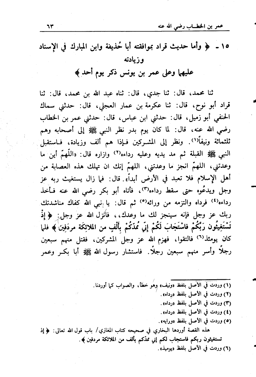 §15 - وَأَمَّا حَدِيثُ قُرَادٍ بِمُوَافَقَتِهِ أَبَا حُذَيْفَةَ، وَابْنَ الْمُبَارَكِ فِي الْإِسْنَادِ وَزِيَادَتِهِ عَلَيْهِمَا وَعَلَى عُمَرَ بْنِ يُونُسَ ذِكْرَ يَوْمِ أُحُدٍ