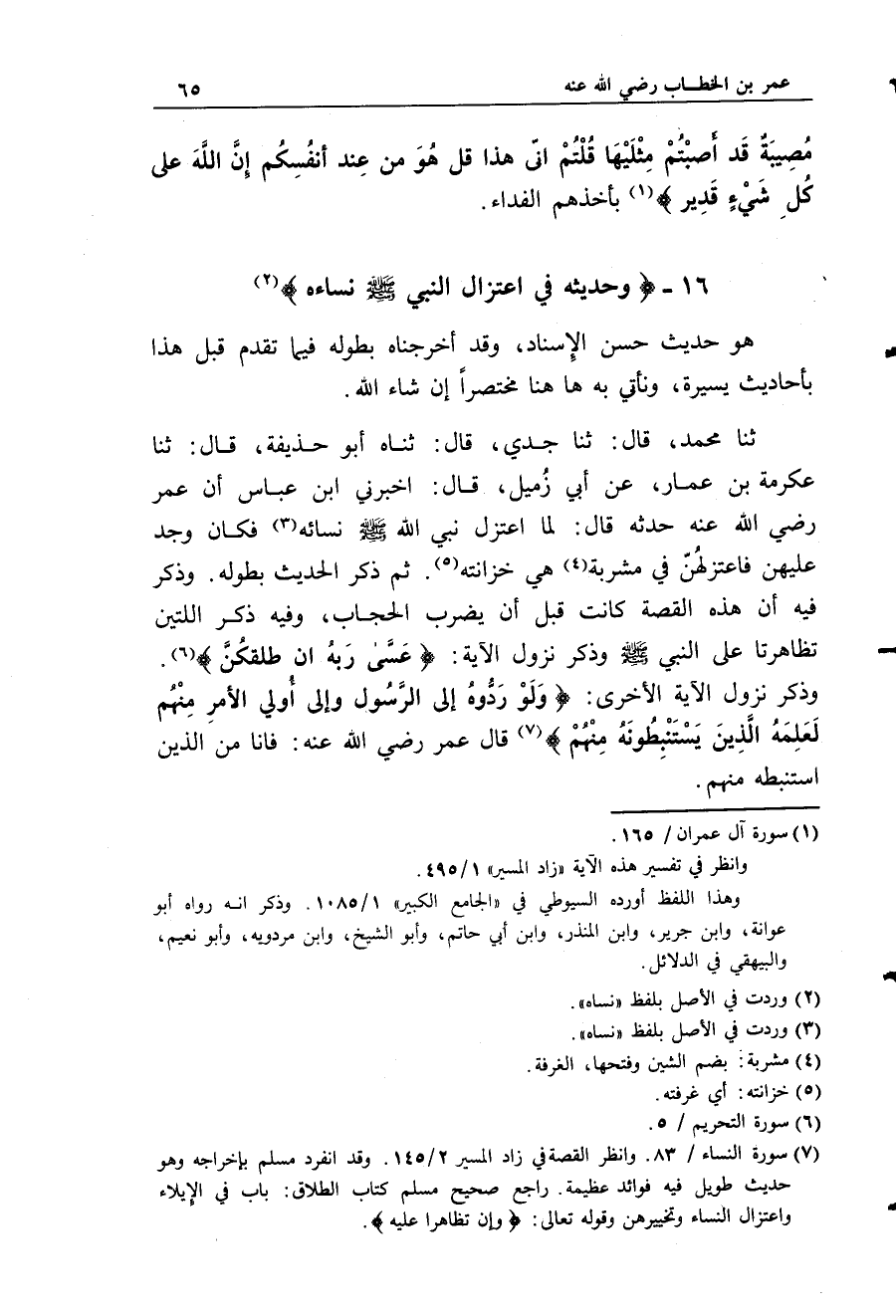 §16 - وَحَدِيثُهُ فِي اعْتِزَالِ النَّبِيِّ صَلَّى اللهُ عَلَيْهِ وَسَلَّمَ نِسَاءَهُ هُوَ حَدِيثٌ حَسَنُ الْإِسْنَادِ وَقَدْ أَخْرَجْنَاهُ بِطُولِهِ فِيمَا تَقَدَّمَ قَبْلَ هَذَا بِأَحَادِيثَ يَسِيرَةٍ، وَنَأْتِي بِهِ هَاهُنَا مُخْتَصَرًا إِنْ شَاءَ اللَّهُ