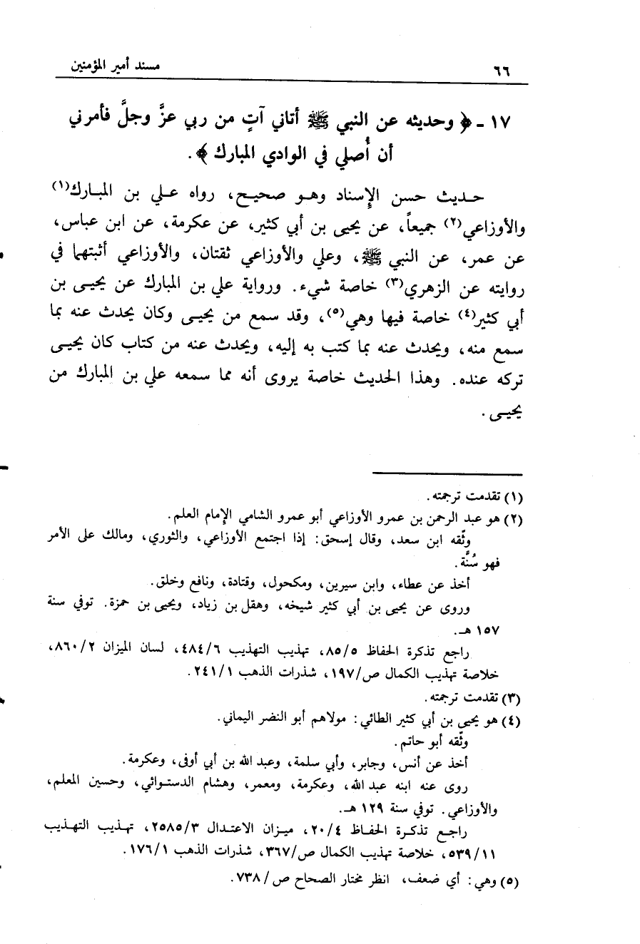 §17 - وَحَدِيثُهُ عَنِ النَّبِيِّ صَلَّى اللهُ عَلَيْهِ وَسَلَّمَ، «أَتَانِي آتٍ مِنْ رَبِّي عَزَّ وَجَلَّ، فَأَمَرَنِي أَنْ أُصَلِّيَ فِي الْوَادِي الْمُبَارَكِ» حَدِيثٌ حَسَنُ الْإِسْنَادِ، وَهُوَ صَحِيحٌ رَوَاهُ عَلِيُّ بْنُ الْمُبَارَكِ، وَالْأَوْزَاعِيُّ جَمِيعًا، عَنْ يَحْيَى بْنِ أَبِي كَثِيرٍ، عَنْ عِكْرِمَةَ، عَنِ ابْنِ عَبَّاسٍ، عَنْ عُمَرَ، عَنِ النَّبِيِّ صَلَّى اللهُ عَلَيْهِ وَسَلَّمَ، وَعَلِيٌّ وَالْأَوْزَاعِيُّ ثِقَتَانِ، وَالْأَوْزَاعِيُّ أَثْبَتُهُمَا فِي رِوَايَتِهِ عَنِ الزُّهْرِيِّ خَاصَّةً، وَرِوَايَةُ عَلِيِّ بْنِ الْمُبَارَكِ، عَنْ يَحْيَى بْنِ أَبِي كَثِيرٍ خَاصَّةً فِيهَا وَهْي، وَقَدْ سَمِعَ مِنَ يَحْيَى، وَكَانَ يُحَدِّثُ عَنْهُ بِمَا سَمِعَ مِنْهُ وَيُحَدِّثُ عَنْهُ، بِمَا كَتَبَ بِهِ إِلَيْهِ، وَيُحَدِّثُ عَنْهُ مِنْ كِتَابٍ كَانَ يَحْيَى تَرَكَهُ عِنْدَهُ، وَهَذَا الْحَدِيثُ خَاصَّةً يُرْوَى أَنَّهُ مِمَّا سَمِعَهُ عَلِيُّ بْنُ الْمُبَارَكِ مِنْ يَحْيَى -[67]- ثَنَا مُحَمَّدٌ , قَالَ: ثَنَا جَدِّي , قَالَ: سَمِعْتُ ابْنَ الْمَدِينِيِّ يَقُولُ: سَمِعْتُ يَحْيَى بْنَ سَعِيدٍ يَقُولُ: قَالَ عَلِيُّ بْنُ الْمُبَارَكِ: كِتَابُ يَحْيَى بْنُ أَبِي كَثِيرٍ هَذَا بَعَثَ بِهِ إِلَيَّ مِنَ الْيَمَامَةِ أَوْ خَلَّفَهُ عِنْدِي، شَكَّ يَحْيَى بْنُ سَعِيدٍ قَالَ: وَلَمْ أَسْمَعْهُ مِنْ يَحْيَى بْنِ أَبِي كَثِيرٍ ثَنَا مُحَمَّدٌ , قَالَ: ثَنَا جَدِّي , قَالَ سَمِعْتُ عَلِيًّا، وَقِيلَ، لَهُ سَمَاعٌ عَلِيَّ بْنَ الْمُبَارَكِ، عَنْ يَحْيَى بْنِ أَبِي كَثِيرٍ، فَقَالَ عَلِيٌّ: قَالَ يَحْيَى يَعْنِي ابْنَ سَعِيدٍ: كَانَ عِنْدَهُ كِتَابَانِ: وَاحِدٌ سَمِعَهُ مِنْ، يَحْيَى، وَالْآخَرُ تَرَكَهُ عِنْدَهُ قِيلَ لِعَلِيٍّ: فِرِوَايَةُ يَحْيَى بْنِ سَعِيدٍ عَنْهُ، يَعْنِي عَنْ عَلِيِّ بْنِ الْمُبَارَكِ. فَقَالَ: عَلِيٌّ لَمْ يَسْمَعْ يَحْيَى بْنُ سَعِيدٍ مِنْهُ إِلَّا مَا سَمِعَ مِنْ يَحْيَى بْنِ أَبِي كَثِيرٍ ثَنَا مُحَمَّدٌ , قَالَ: ثَنَا جَدِّي , قَالَ: سَمِعْتُ عَلِيَّ بْنَ عَبْدِ اللَّهِ، يَقُولُ: «عَلِيُّ بْنُ الْمُبَارَكِ أَحَبُّ إِلَيَّ مِنْ أَبَانَ» قَالَ أَبُو يُوسُفَ " وَالْأَوْزَاعِيُّ: اسْمُهُ عَبْدُ الرَّحْمَنِ بْنُ عَمْرٍو، وَكُنْيَتُهُ أَبُو عَمْرٍو، وَهُوَ ثِقَةٌ ثَبَتٌ إِلَّا أَنَّ رِوَايَتَهُ عَنِ الزُّهْرِيِّ خَاصَّةً، فَإِنَّ فِيهَا -[68]- شَيْئًا وَقَدْ رَوَى عَنْهُ يَحْيَى بْنُ أَبِي كَثِيرٍ، وَمَالِكُ بْنُ أَنَسٍ، وَسُفْيَانُ الثَّوْرِيُّ، وَسَنَذْكُرُ مِنْ رِوَايَتِهِمْ عَنْهُ شَيْئًا، فِي عِقْدِ مَا نَذْكُرُ مِنْ أَخْبَارِهِ إِنْ شَاءَ اللَّهُ ثَنَا مُحَمَّدٌ , قَالَ: ثَنَا جَدِّي , قَالَ: وَسَمِعْتُ يَعْلَى بْنَ عُبَيْدٍ الطَّنَافِسِيَّ، قَالَ: قَالَ رَجُلٌ لِسُفْيَانَ الثَّوْرِيِّ: رَأَيْتُ كَأَنَّ رَيْحَانَةً مِنَ الشَّامِ رُفِعَتْ. فَقَالَ سُفْيَانُ الثَّوْرِيُّ: «إِنْ صَدَقَتْ رُؤْيَاكَ، فَقَدْ مَاتَ الْأَوْزَاعِيُّ مَغْرِبَ ذَلِكَ الْيَوْمِ» فَوَجَدْتُ مَوْتَ الْأَوْزَاعِيِّ فِيهِ ثَنَا مُحَمَّدٌ , قَالَ: ثَنَا جَدِّي , قَالَ: سَمِعْتُ عَلِيَّ بْنَ عَبْدِ اللَّهِ، يَقُولُ: سَمِعْتُ ابْنَ مَهْدِيٍّ، يَقُولُ: رَجُلَانِ مِنْ أَهْلِ الشَّامِ إِذَا رَأَيْتَ رَجُلًا يُحِبُّهُمَا -[69]- فَاطْمَئِنَّ إِلَيْهِ: الْأَوْزَاعِيُّ وَأَبُو إِسْحَاقَ الْفَزَارِيُّ ثَنَا مُحَمَّدٌ , قَالَ: ثَنَا جَدِّي , قَالَ: ثَنَا مُحَمَّدُ بْنُ إِسْمَاعِيلَ، عَنْ أَبِي دَاوُدَ، قَالَ سَمِعْتُ يَحْيَى بْنَ مَعِينٍ، يَقُولُ: الْأَوْزَاعِيُّ ثِقَةٌ وَهُوَ أَحَبُّ إِلَيَّ مِنْ عَبْدِ الرَّحْمَنِ بْنِ يَزِيدَ بْنِ جَابِرٍ، وَعَبْدُ الرَّحْمَنِ بْنُ يَزِيدَ بْنِ جَابِرٍ ثِقَةٌ