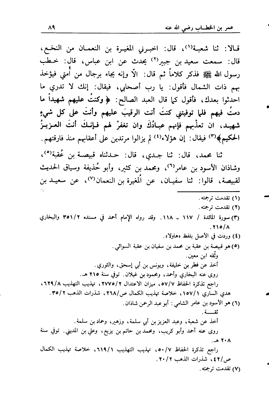ثَنَا مُحَمَّدٌ , قَالَ: ثَنَا جَدِّي , قَالَ: حَدَّثَنَاهُ قَبِيصَةُ بْنُ عُقْبَةَ، وَشَاذَانُ الْأَسْوَدُ بْنُ عَامِرٍ، وَمُحَمَّدُ بْنُ كَثِيرٍ، وَأَبُو حُذَيْفَةَ، وَسِيَاقُ الْحَدِيثِ، لِقَبِيصَةَ، قَالُوا: ثَنَا سُفْيَانُ، عَنِ الْمُغِيرَةِ بْنِ النُّعْمَانِ، عَنْ سَعِيدِ بْنِ -[90]- جُبَيْرٍ، عَنِ ابْنِ عَبَّاسٍ، قَالَ: قَالَ رَسُولُ اللَّهِ صَلَّى اللهُ عَلَيْهِ وَسَلَّمَ فَذَكَرَ الْحَدِيثَ، قَالَ: " §ثُمَّ يُنْطَلَقُ بِطَائِفَةٍ مِنْ أُمَّتِي ذَاتَ الشِّمَالِ فَأَقُولُ: يَا رَبِّ أُمَّتِي أُمَّتِي، فَيُقَالُ إِنَّكَ لَا تَدْرِي مَا أَحْدَثُوا بَعْدَكَ، قَالَ أَبُو حُذَيْفَةَ فِي حَدِيثِهِ: فَأَقُولُ يَا رَبِّ أَصْحَابِي أَصْحَابِي، فَيُقَالُ: إِنَّهُمْ لَمْ يَزَالُوا مُرْتَدِّينَ عَلَى أَعْقَابِهِمْ مُنْذُ فَارَقْتَهُمْ، فَأَقُولُ كَمَا قَالَ الْعَبْدُ الصَّالِحُ عِيسَى ابْنُ مَرْيَمَ عَلَيْهِ السَّلَامُ {وَكُنْتُ عَلَيْهِمْ شَهِيدًا مَا دُمْتُ فِيهِمْ فَلَمَّا تَوَفَّيْتَنِي كُنْتَ أَنْتَ الرَّقِيبَ عَلَيْهِمْ وَأَنْتَ عَلَى كُلِّ شَيْءٍ شَهِيدٌ} [المائدة: 117] "