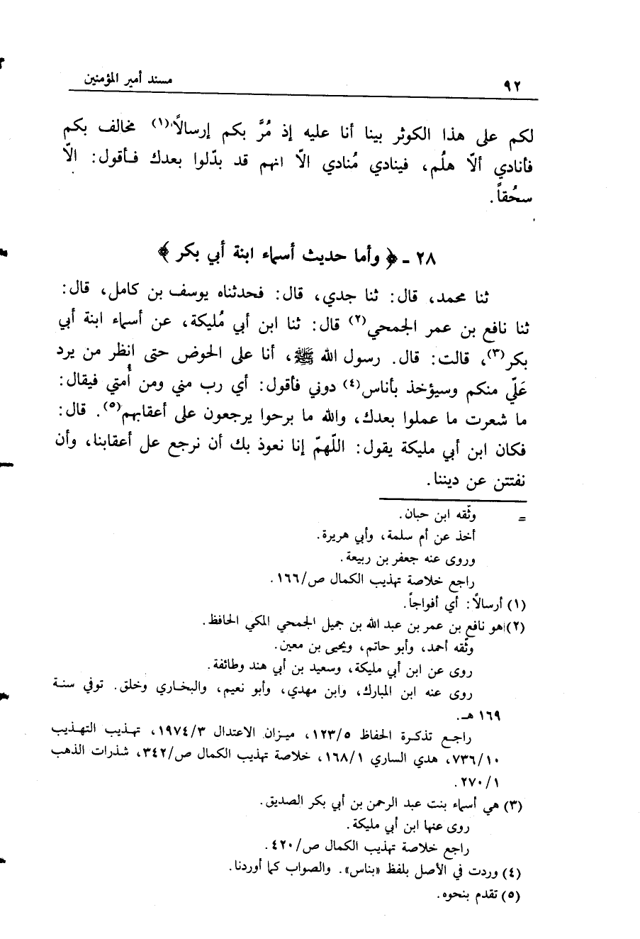 ثَنَا مُحَمَّدٌ , قَالَ: ثَنَا جَدِّي , قَالَ: فَحَدَّثَنَاهُ يُوسُفُ بْنُ كَامِلٍ، قَالَ: ثَنَا نَافِعُ بْنُ عُمَرَ الْجُمَحِيُّ، قَالَ: ثَنَا ابْنُ أَبِي مُلَيْكَةَ، عَنْ أَسْمَاءَ ابْنَةِ أَبِي بَكْرٍ، قَالَتْ: قَالَ رَسُولُ اللَّهِ صَلَّى اللهُ عَلَيْهِ وَسَلَّمَ: " §أَنَا عَلَى الْحَوْضِ حَتَّى أَنْظُرَ مَنْ يَرِدُ عَلَيَّ مِنْكُمْ وَسَيُؤْخَذُ بِأَنَاسٍ دُونِي فَأَقُولُ: أَيْ رَبِّ، مِنِّي وَمِنْ أُمَّتِي فَيُقَالُ مَا شَعَرْتَ مَا عَمِلُوا بَعْدَكَ وَاللَّهِ مَا بَرِحُوا يَرْجِعُونَ عَلَى أَعْقَابِهِمْ " قَالَ: فَكَانَ ابْنُ أَبِي مُلَيْكَةَ يَقُولُ: «اللَّهُمَّ إِنَّا نَعُوذُ بِكَ أَنْ نَرْجِعَ عَلَى أَعْقَابِنَا وَأَنْ نُفْتَتَنَ عَنْ دِينِنَا»