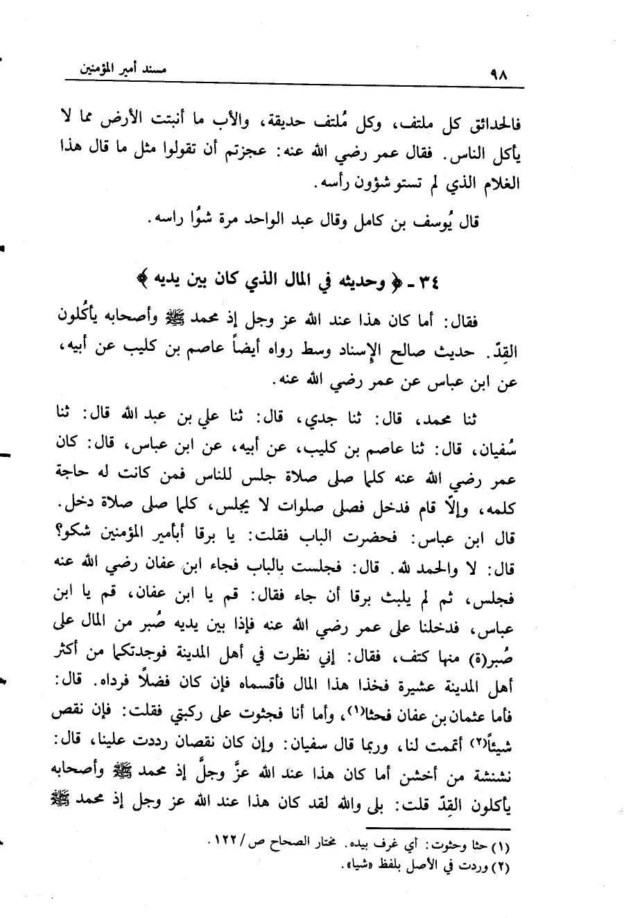 §34 - وَحَدِيثُهُ فِي الْمَالِ الَّذِي كَانَ بَيْنَ يَدَيْهِ فَقَالَ: أَمَا كَانَ هَذَا عِنْدَ اللَّهِ عَزَّ وَجَلَّ إِذْ مُحَمَّدٌ صَلَّى اللهُ عَلَيْهِ وَسَلَّمَ وَأَصْحَابُهُ يَأْكُلُونَ الْقِدَّ حَدِيثٌ صَالِحُ الْإِسْنَادِ وَسَطٌ رَوَاهُ أَيْضًا عَاصِمُ بْنُ كُلَيْبٍ، عَنْ أَبِيهِ عَنِ ابْنِ عَبَّاسٍ، عَنْ عُمَرَ رَضِيَ اللَّهُ عَنْهُ