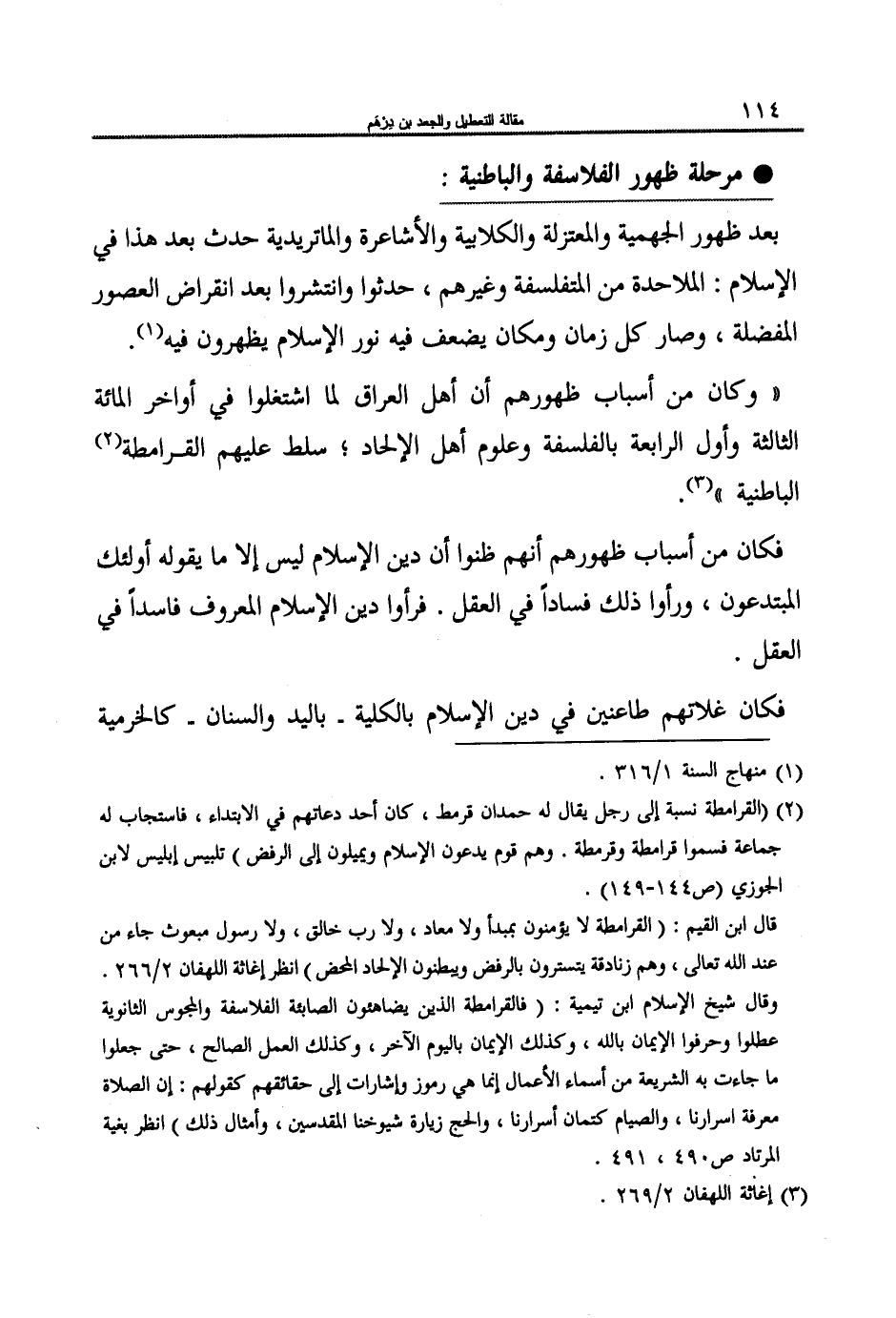 (وكان من أسباب ظهورهم أن أهل العراق لما اشتغلوا في أواخر المائة الثالثة وأول الرابعة بالفلسفة وعلوم أهل الإلحاد، سلط عليهم القرامطة2 الباطنية)