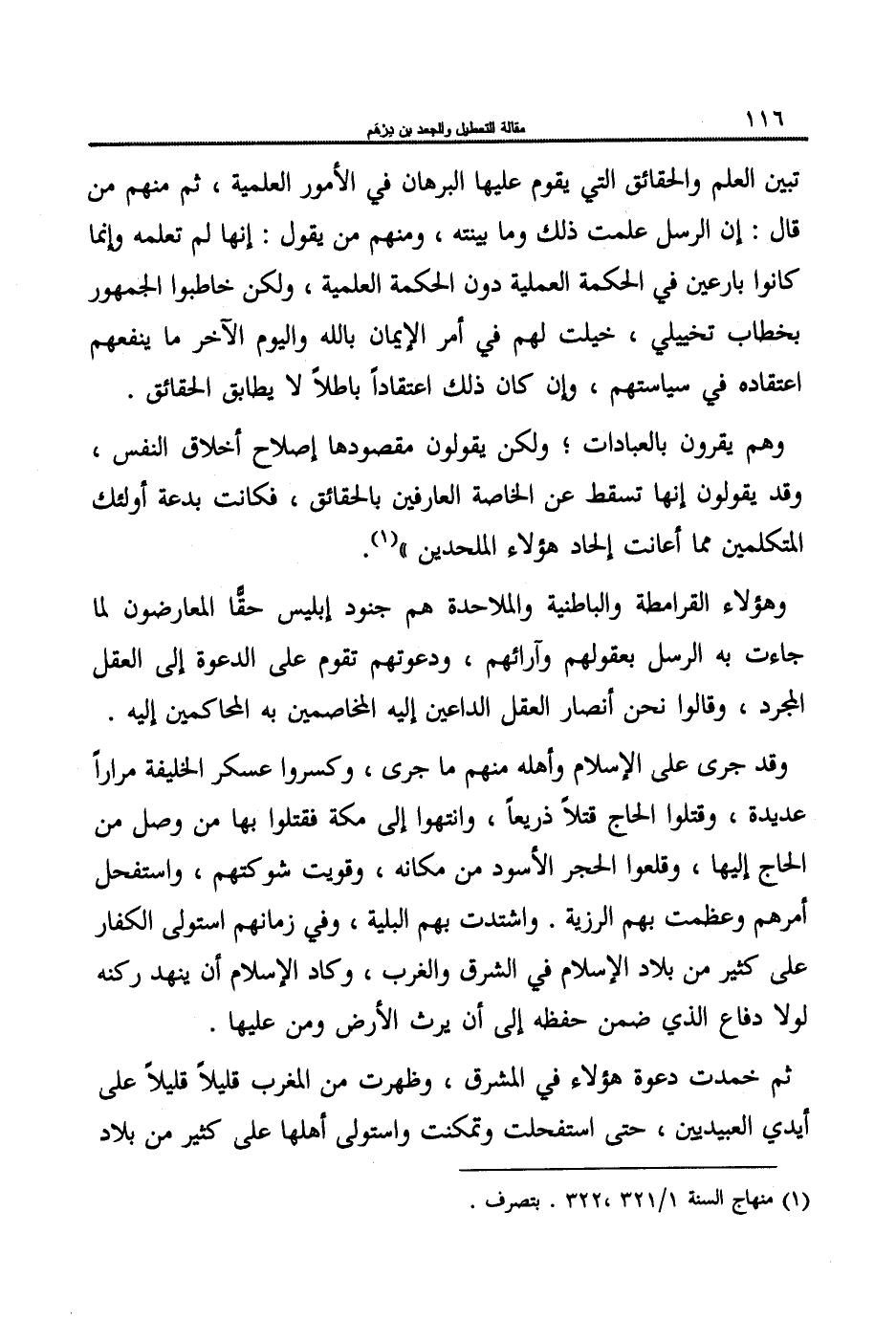(وهؤلاء القرامطة والباطنية والملاحدة هم جنود إبليس حقاً المعارضون لما جاءت به الرسل بعقولهم وآرائهم، ودعوتهم تقوم على الدعوة إلى العقل المجرد، وقالوا نحن أنصار العقل الداعين إليه المخاصمين به المحاكمين إليه.