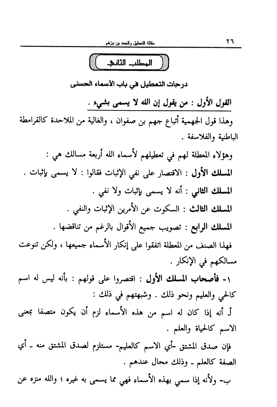 1- فأصحاب المسلك الأول: اقتصروا على قولهم: بأنه ليس له اسم كالحي والعليم ونحو ذلك. وشبهتهم في ذلك: