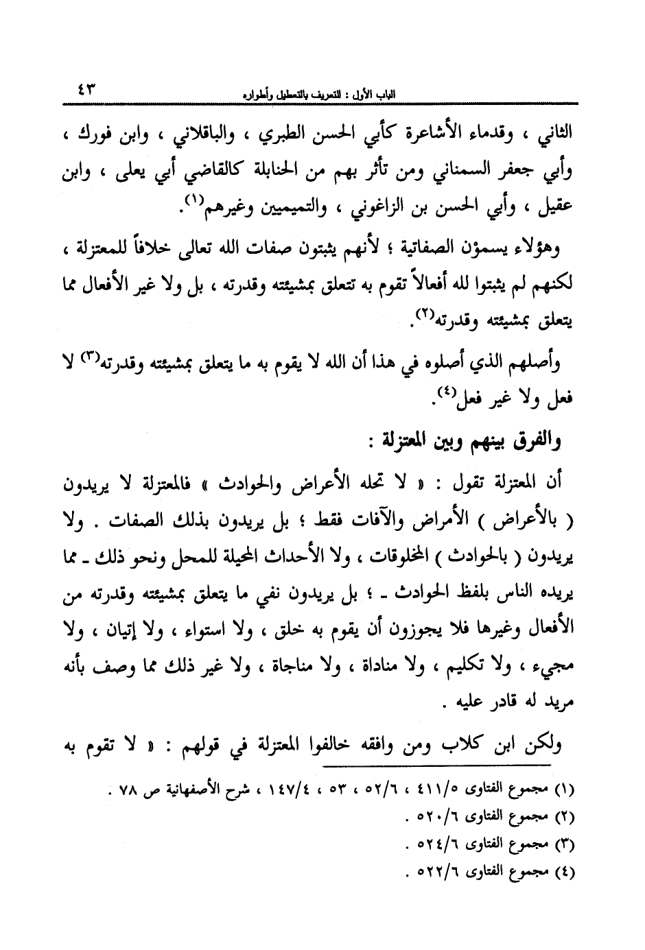 أن المعتزلة تقول: (لا تحله الأعراض والحوادث) فالمعتزلة لا يريدون [بالأعراض] الأمراض والآفات فقط، بل يريدون بذلك الصفات. ولا يريدون [بالحوادث] المخلوقات، ولا الأحداث المحيلة للمحل ونحو ذلك -مما يريده الناس بلفظ الحوادث- بل يريدون نفي ما يتعلق بمشيئته وقدرته من الأفعال وغيرها فلا يجوزون أن يقوم به خلق، ولا استواء، ولا إتيان، ولا مجيء، ولا تكليم، ولا مناداة، ولا مناجاة، ولا غير ذلك مما وصف بأنه مريد له قادر عليه.