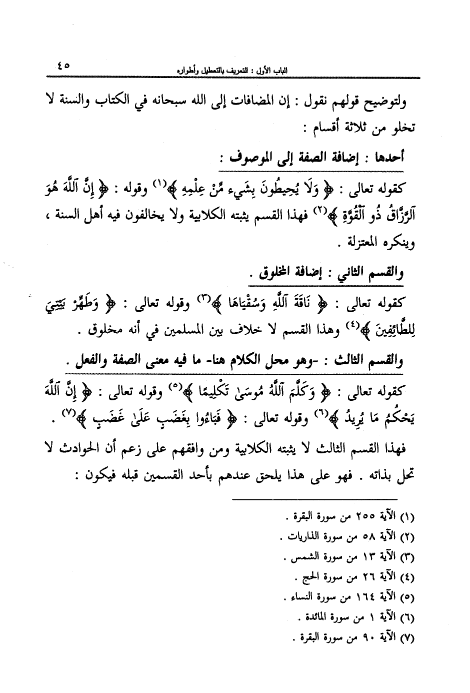 ولتوضيح قولهم نقول: إن المضافات إلى الله سبحانه في الكتاب والسنة لا تخلو من ثلاثة أقسام: