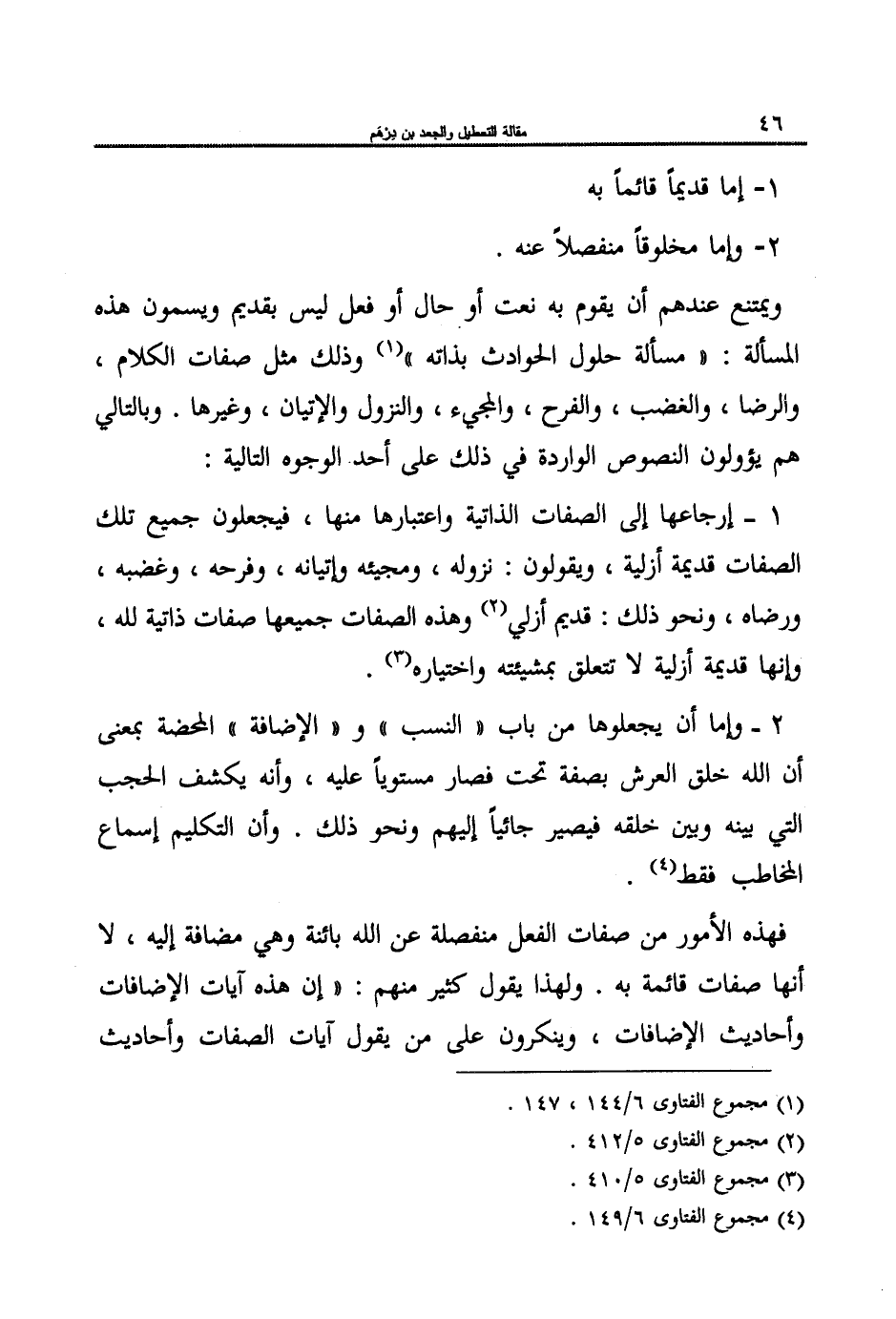 (2) - وإما أن يجعلوها من باب "النسب" و"الإضافة" المحضة بمعنى أن الله خلق العرش بصفة تحت فصار مستوياً عليه، وأنه يكشف الحجب التي بينه وبين خلقه فيصير جائياً إليهم ونحو ذلك. وأن التكليم إسماع المخاطب فقط.4