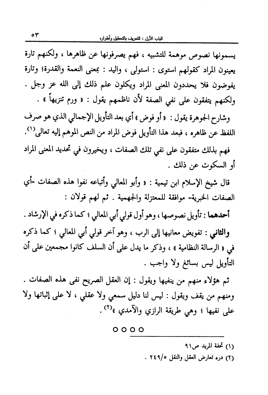 ثم هؤلاء منهم من ينفيها ويقول: إن العقل الصريح نفى هذه الصفات. ومنهم من يقف ويقول: ليس لنا دليل سمعي ولا عقلي، لا على إثباتها ولا على نفيها، وهي طريقة الرازي والآمدي) .2