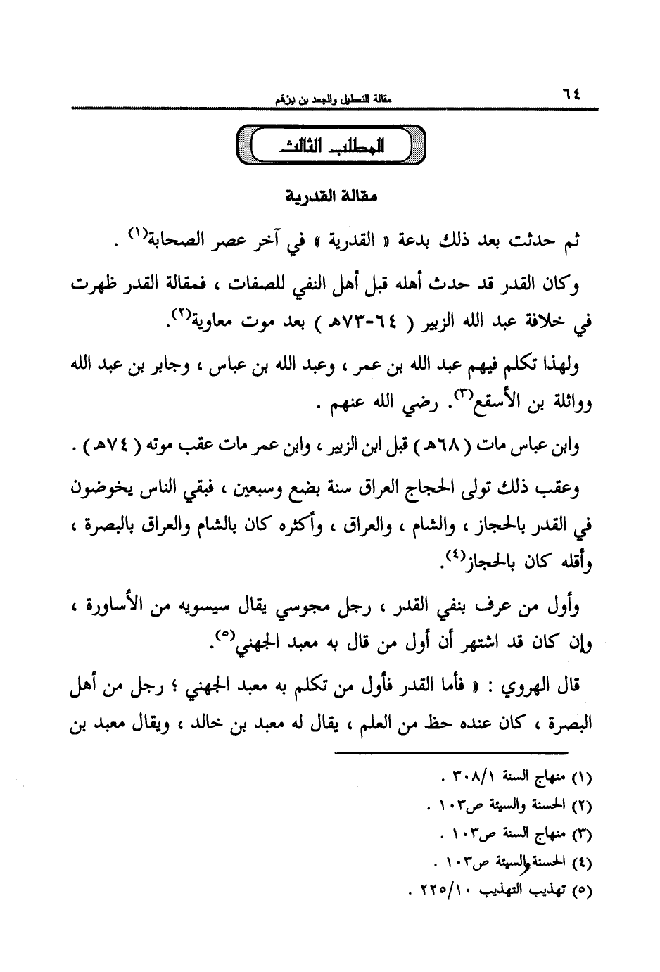 ثم حدثت بعد ذلك بدعة "القدرية" في آخر عصر الصحابة1 وكان القدر قد حدث أهله قبل أهل النفي للصفات، فمقالة القدر ظهرت في خلافة عبد الله الزبير (64-73هـ) بعد موت معاوية.2