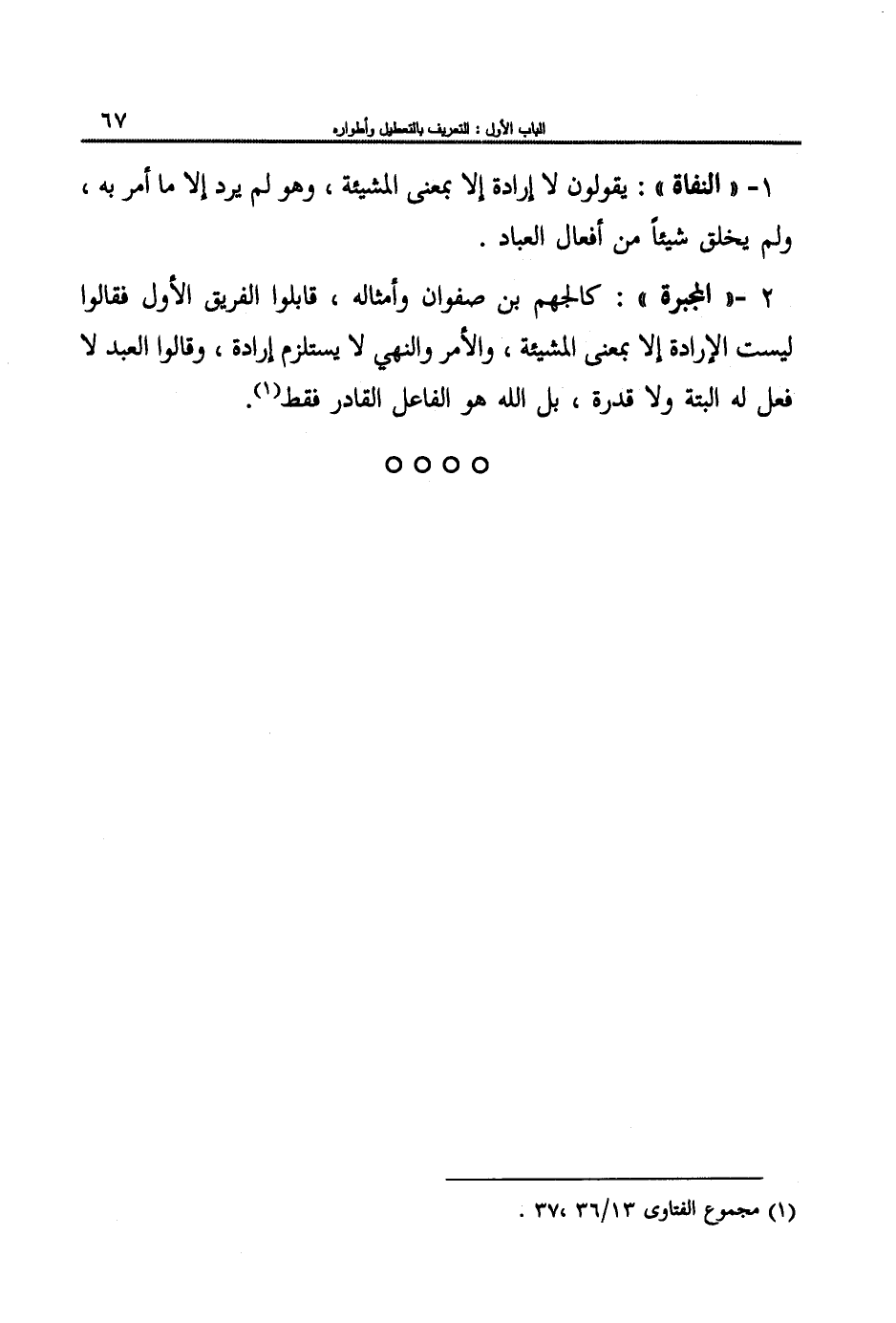 2- "المجبرة" كالجهم بن صفوان وأمثاله، قابلوا الفريق الأول فقالوا ليست الإرادة إلا بمعنى المشيئة، والأمر والنهي لا يستلزم إرادة، وقالوا العبد لا فعل له البتة ولا قدرة، بل الله هو الفاعل القادر فقط.1