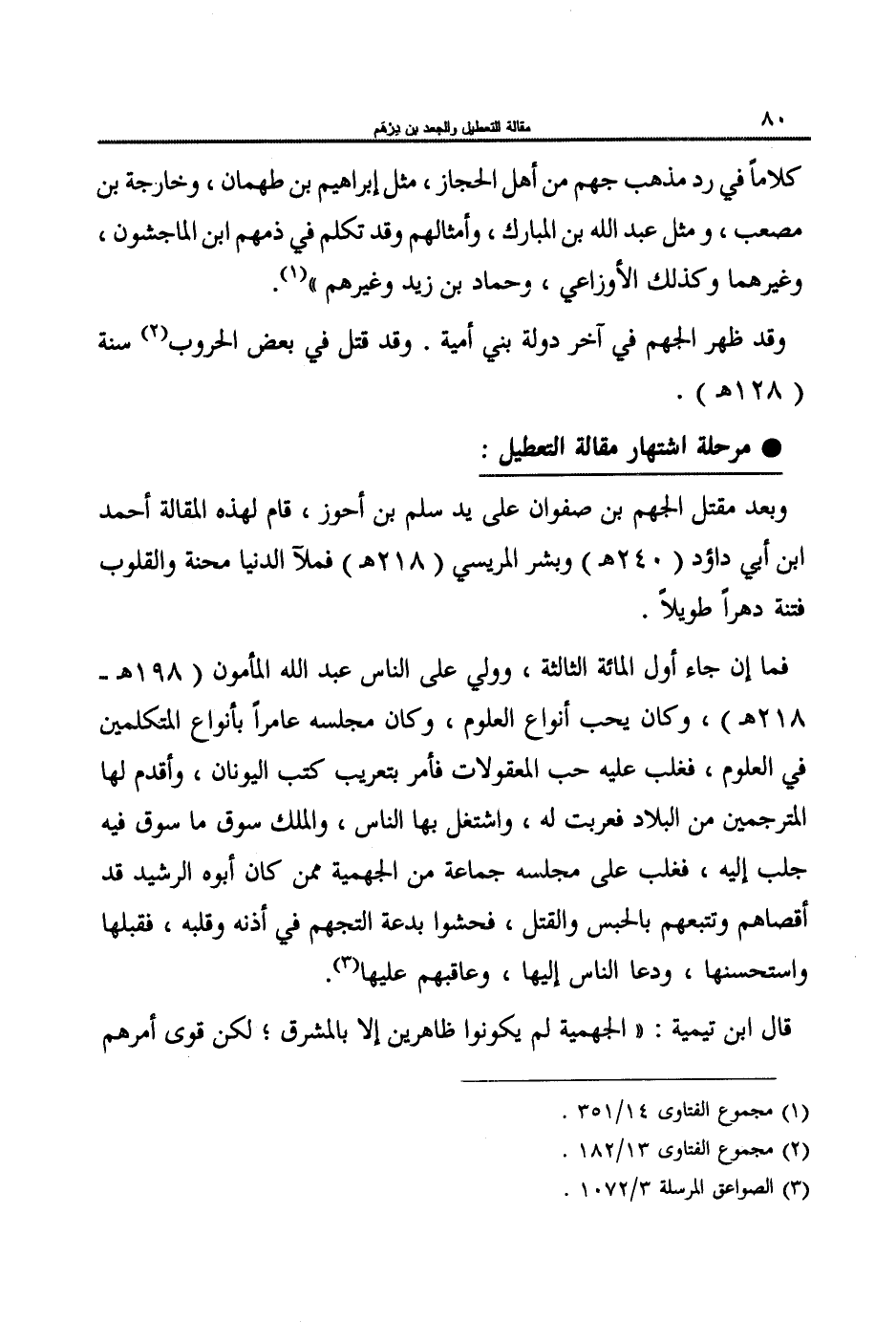 (فما إن جاء أول المائة الثالثة، وولي على الناس عبد الله المأمون (198هـ - 218هـ) ، وكان يحب أنواع العلوم، وكان مجلسه عامراً بأنواع المتكلمين في العلوم، فغلب عليه حب المعقولات فأمر بتعريب كتب اليونان، وأقدم لها المترجمين من البلاد فعربت له، واشتغل بها الناس، والملك سوق ما سوق فيه جلب إليه، فغلب على مجلسه جماعة من الجهمية ممن كان أبوه الرشيد قد أقصاهم وتتبعهم بالحبس والقتل. فحشوا بدعة التجهم في أذنه وقلبه، فقبلها، واستحسنها، ودعا الناس إليها، وعاقبهم عليها)