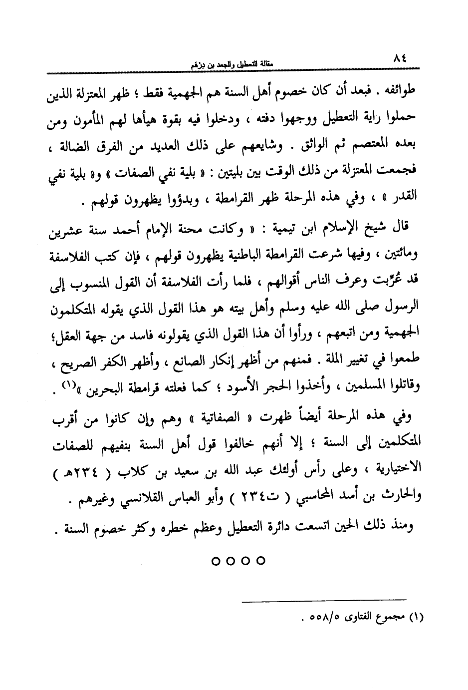 طوائفه. فبعد أن كان خصوم أهل السنة هم الجهمية فقط، ظهر المعتزلة الذين حملوا راية التعطيل ووجهوا دفته، ودخلوا فيه بقوة هيأها لهم المأمون ومن بعده المعتصم ثم الواثق. وشايعهم على ذلك العديد من الفرق الضالة، فجمعت المعتزلة من ذلك الوقت بين بليتين "بلية نفي الصفات" و"بلية نفي القدر". وفي هذه المرحلة ظهر القرامطة، وبدؤوا يظهرون قولهم.