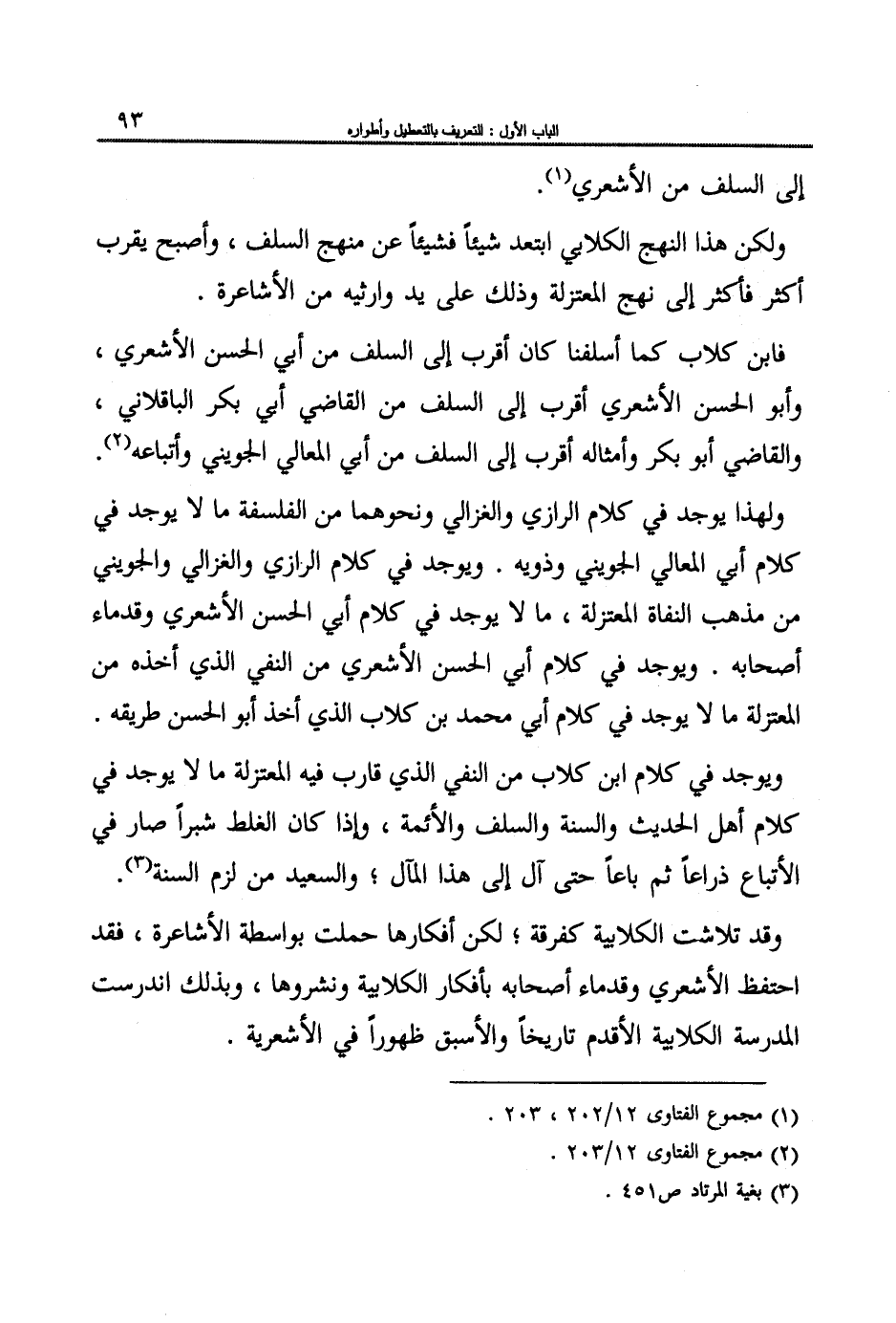 ولهذا يوجد في كلام الرازي والغزالي ونحوهما من الفلسفة مالا يوجد في كلام أبي المعالي الجويني وذويه. ويوجد في كلام الرازي والغزالي والجويني من مذهب النفاة المعتزلة ما لا يوجد في كلام أبي الحسن الأشعري وقدماء أصحابه. ويوجد في كلام أبي الحسن الأشعري من النفي الذي أخذه من المعتزلة ما لا يوجد في كلام أبي محمد بن كلاب الذي أخذ أبو الحسن طريقه.