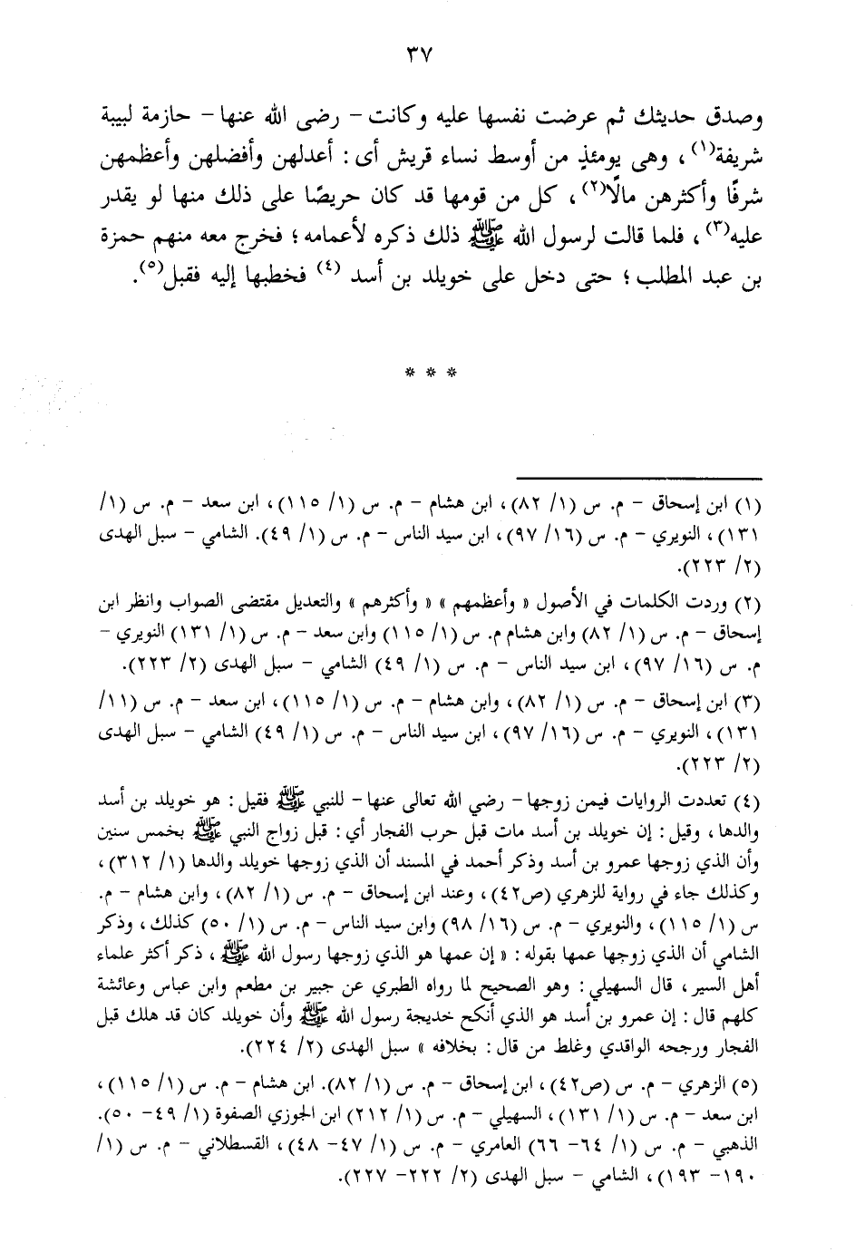 وَصدق حَدِيثك ثمَّ عرضت نَفسهَا عَلَيْهِ وَكَانَت رَضِي الله عَنْهَا حازمة لَبِيبَة شريفة وَهِي يَوْمئِذٍ من أَوسط نسَاء قُرَيْش أَي أعدلهن وأفضلهن وأعظمهن شرفا وأكثرهن مَالا كل من قَومهَا قد كَانَ حَرِيصًا على ذَلِك مِنْهَا لَو يقدر عَلَيْهِ فَلَمَّا قَالَت لرَسُول الله ذَلِك (ذكره لأعمامه، فَخرج مَعَه مِنْهُم حَمْزَة بن عبد الْمطلب، حَتَّى دخل على خويلد بن أَسد فَخَطَبَهَا اليه فَقبل)