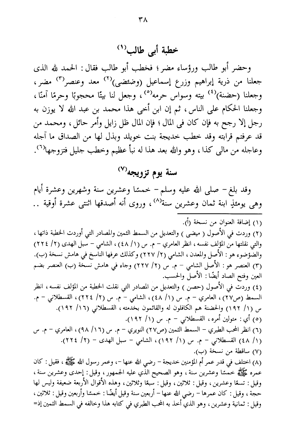 وَحضر أَبُو طَالب ورؤساء مُضر فَخَطب أَبُو طَالب فَقَالَ الْحَمد لله الَّذِي جعلنَا من ذُرِّيَّة إِبْرَاهِيم وَزرع إِسْمَاعِيل وضئضى معد وعنصر مُضر وَجَعَلنَا حضنة بَيته وسواس حرمه وَجعل لنا بَيْتا محجوبا وحرما آمنا وَجَعَلنَا الْحُكَّام على النَّاس ثمَّ إِن ابْن أخي هَذَا مُحَمَّد بن عبد الله لَا يُوزن بِهِ رجل إِلَّا رجح بِهِ فَإِن كَانَ فِي المَال فَإِن المَال ظلّ زايل وَأمر حَائِل وَمُحَمّد من قد عَرَفْتُمْ قرَابَته وَقد خطب خَدِيجَة بنت خويلد وبذل لَهَا من الصَدَاق مَا آجله وعاجله من مَالِي كَذَا وَهُوَ وَالله بعد هَذَا لَهُ نبأ عَظِيم وخطب جليل فَتَزَوجهَا