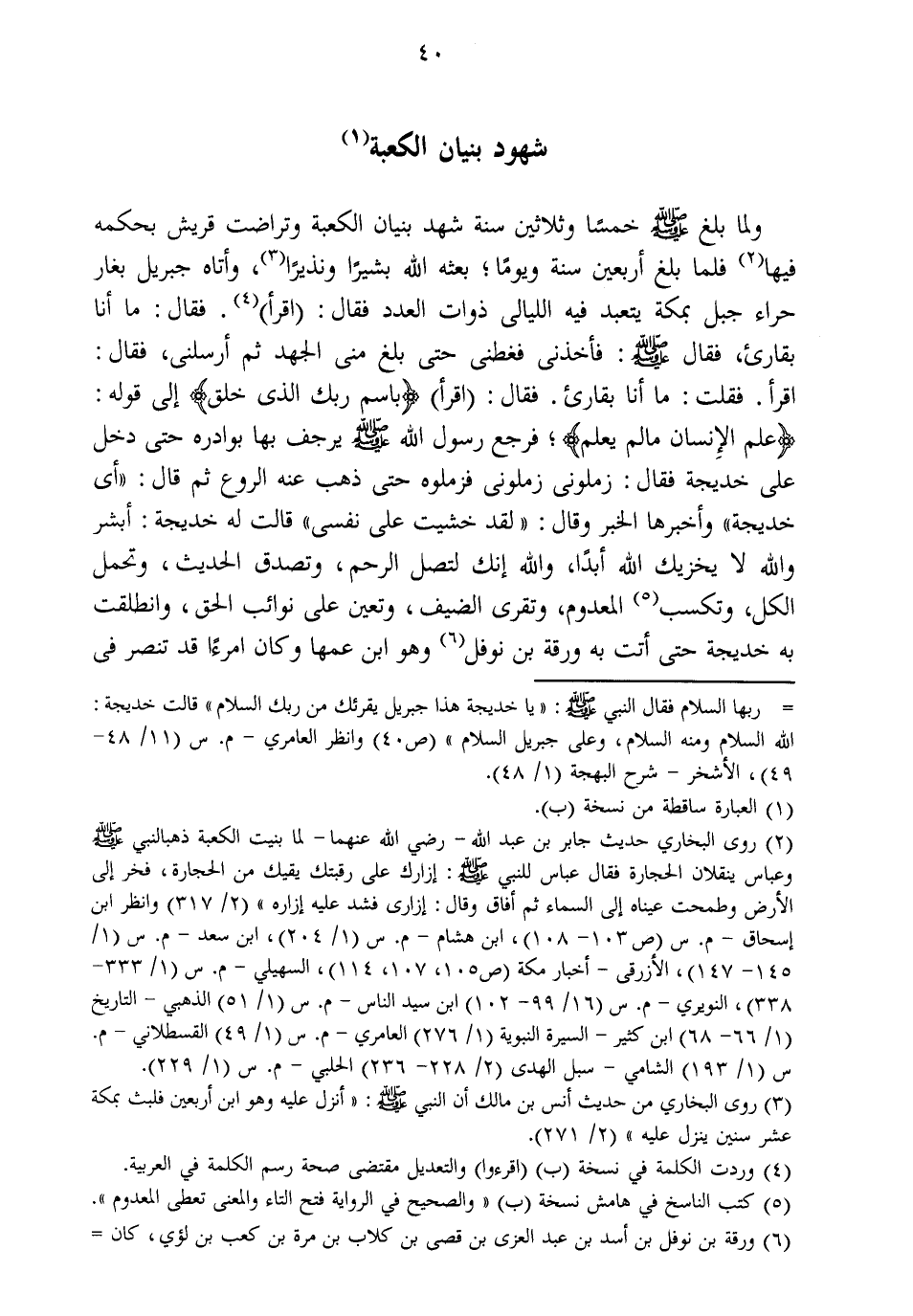 وَلما بلغ صلى الله عَلَيْهِ وَسلم خمْسا وَثَلَاثِينَ سنة شهد بُنيان الْكَعْبَة وتراضت قُرَيْش بِحكمِهِ فِيهَا فَلَمَّا بلغ أَرْبَعِينَ سنة وَيَوْما بَعثه الله بشيرا وَنَذِيرا وَأَتَاهُ جِبْرِيل بِغَار حراء جبل بِمَكَّة يتعبد فِيهِ اللَّيَالِي ذَوَات الْعدَد فَقَالَ اقْرَأ فَقَالَ مَا أَنا بقارئ فَقَالَ صلى الله عَلَيْهِ وَسلم فأخذني فغطني حَتَّى بلغ مني الْجهد ثمَّ أَرْسلنِي فَقَالَ اقْرَأ فَقلت مَا أَنا بقارئ فَقَالَ اقْرَأ {باسم رَبك الَّذِي خلق} إِلَى قَوْله {علم الْإِنْسَان مَا لم يعلم} فَرجع رَسُول الله صلى الله عَلَيْهِ وَسلم يرجف بهَا بوادره حَتَّى دخل على خَدِيجَة فَقَالَ زَمِّلُونِي زَمِّلُونِي فزملوه حَتَّى ذهب عَنهُ الْوَرع ثمَّ قَالَ أَي خَدِيجَة وأخبرها الْخَبَر وَقَالَ لقد خشيت على نَفسِي قَالَت لَهُ خَدِيجَة أبشر وَالله لَا يخزيك الله أبدا وَالله إِنَّك لتصل الرَّحِم وَتصدق الحَدِيث وَتحمل الْكل وتكسب الْمَعْدُوم وتقري الضَّيْف وَتعين على نَوَائِب الْحق وَانْطَلَقت بِهِ خَدِيجَة حَتَّى أَتَت بِهِ ورقة بن نَوْفَل وَهُوَ ابْن عَمها وَكَانَ امْرَءًا قد تنصر فِي