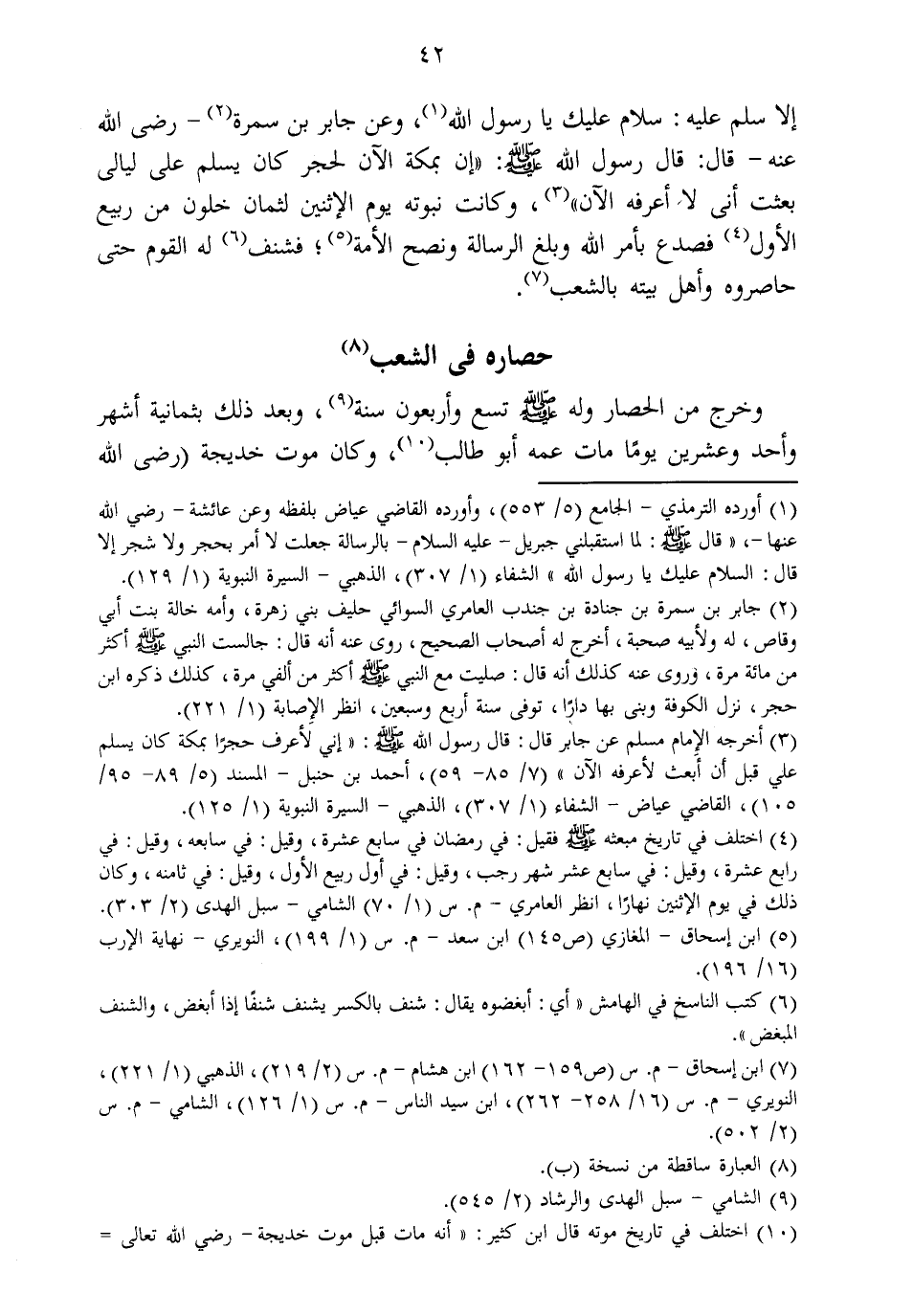 إِلَّا سلم عَلَيْهِ سَلام عَلَيْك يَا رَسُول الله وَعَن جَابر بن سَمُرَة رَضِي الله عَنهُ قَالَ قَالَ رَسُول الله صلى الله عَلَيْهِ وَسلم (إِن بِمَكَّة الْآن لحجر كَانَ يسلم على ليَالِي بعثت أَنِّي لَا أعرفهُ الْآن) وَكَانَت نبوته يَوْم الِاثْنَيْنِ لثمان خلون من ربيع الأول فصدع بِأَمْر الله وَبلغ الرسَالَة ونصح الْأمة فشنف لَهُ الْقَوْم حَتَّى حاصروه وَأهل بَيته بِالشعبِ