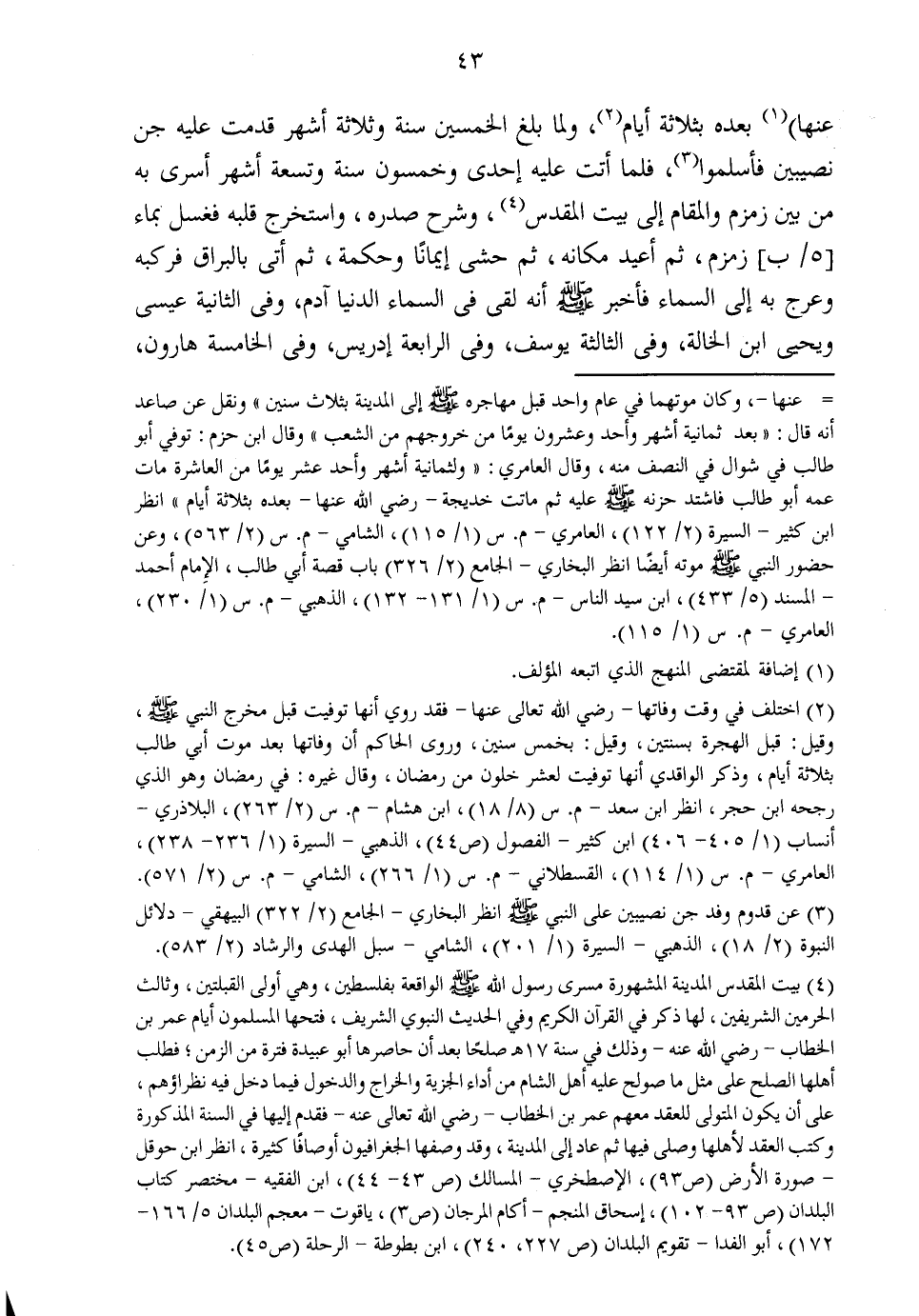 بعده بِثَلَاثَة أَيَّام وَلما بلغ الْخمسين سنة وَثَلَاثَة أشهر قدمت عَلَيْهِ جن نَصِيبين فأسلموا فَلَمَّا أَتَت عَلَيْهِ إِحْدَى وَخَمْسُونَ سنة وَتِسْعَة أشهر أسرى بِهِ من بَين زَمْزَم وَالْمقَام إِلَى بَيت الْمُقَدّس وَشرح صَدره واستخرج قلبه فَغسل بِمَاء زَمْزَم ثمَّ أُعِيد مَكَانَهُ ثمَّ حشي إِيمَانًا وَحِكْمَة ثمَّ أَتَى بِالْبُرَاقِ فَرَكبهُ وعرج بِهِ إِلَى السَّمَاء فَأخْبر صلى الله عَلَيْهِ وَسلم أَنه لقى فِي السَّمَاء الدُّنْيَا آدم وَفِي الثَّانِيَة عِيسَى وَيحيى ابْن الْخَالَة وَفِي الثَّالِثَة يُوسُف وَفِي الرَّابِعَة إِدْرِيس وَفِي الْخَامِسَة هَارُون