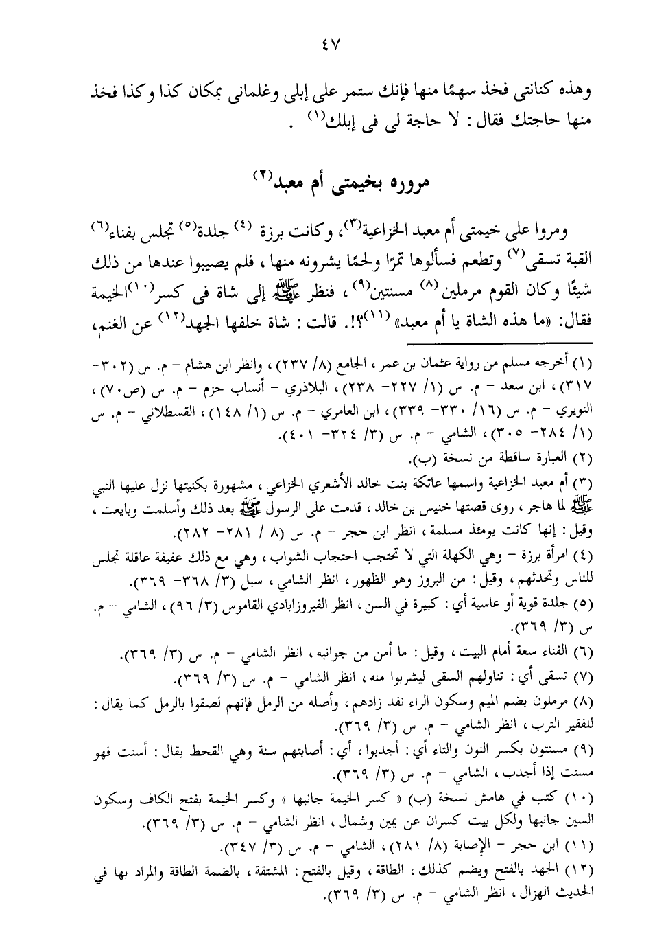 ومروا على خَيْمَتي أم معبد الْخُزَاعِيَّة وَكَانَت بَرزَة جلدَة تجْلِس بِفنَاء الْقبَّة تَسْقِي وَتطعم فَسَأَلُوهَا تَمرا وَلَحْمًا يشرونه مِنْهَا فَلم يُصِيبُوا عِنْدهَا من ذَلِك شَيْئا وَكَانَ الْقَوْم مُرْمِلِينَ مُسنَّتَيْنِ فَنظر صلى الله عَلَيْهِ وَسلم إِلَى شَاة فِي كسر الْخَيْمَة فَقَالَ (مَا هَذِه الشَّاة يَا أم معبد) قَالَت شَاة خلفهَا الْجهد عَن الْغنم
