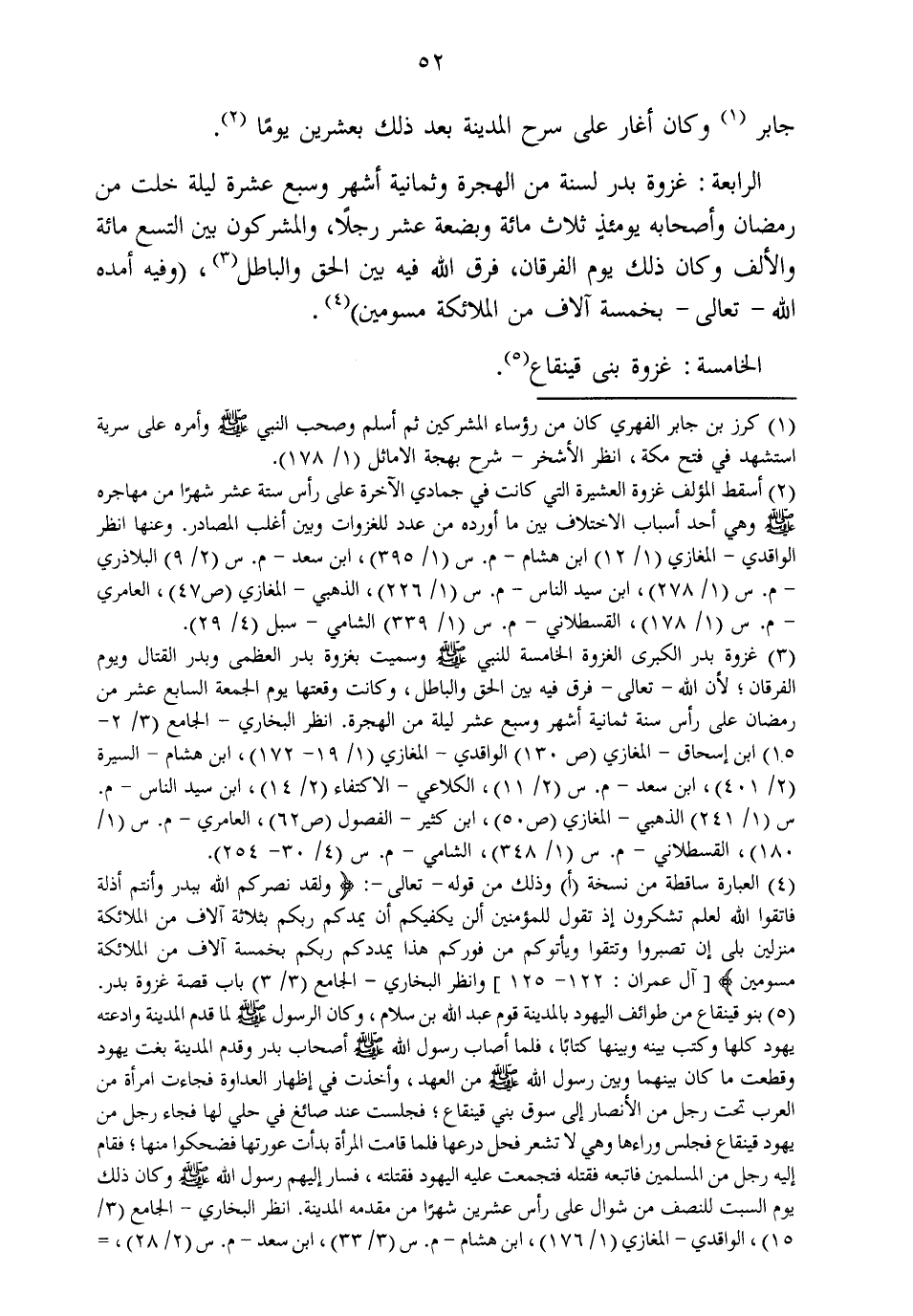 الرَّابِعَة غَزْوَة بدر لسنة من الْهِجْرَة وَثَمَانِية أشهر وَسبع عشرَة لَيْلَة خلت من رَمَضَان وَأَصْحَابه يَوْمئِذٍ ثَلَاث مائَة وَبضْعَة عشر رجلا وَالْمُشْرِكُونَ بَين التسع مئة وَالْألف وَكَانَ ذَلِك يَوْم الْفرْقَان فرق الله فِيهِ بَين الْحق وَالْبَاطِل وَفِيه أمده الله تَعَالَى بِخَمْسَة آلَاف من الْمَلَائِكَة مسومين