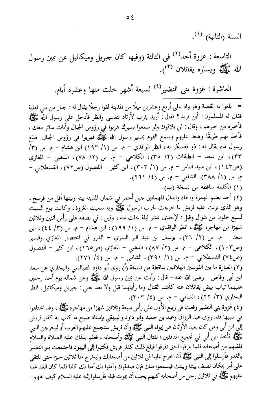 التَّاسِعَة غَزْوَة أحد فِي الثَّالِثَة وفيهَا كَانَ جِبْرِيل وَمِيكَائِيل عَن يَمِين رَسُول الله صلى الله عَلَيْهِ وَسلم ويساره يقاتلان